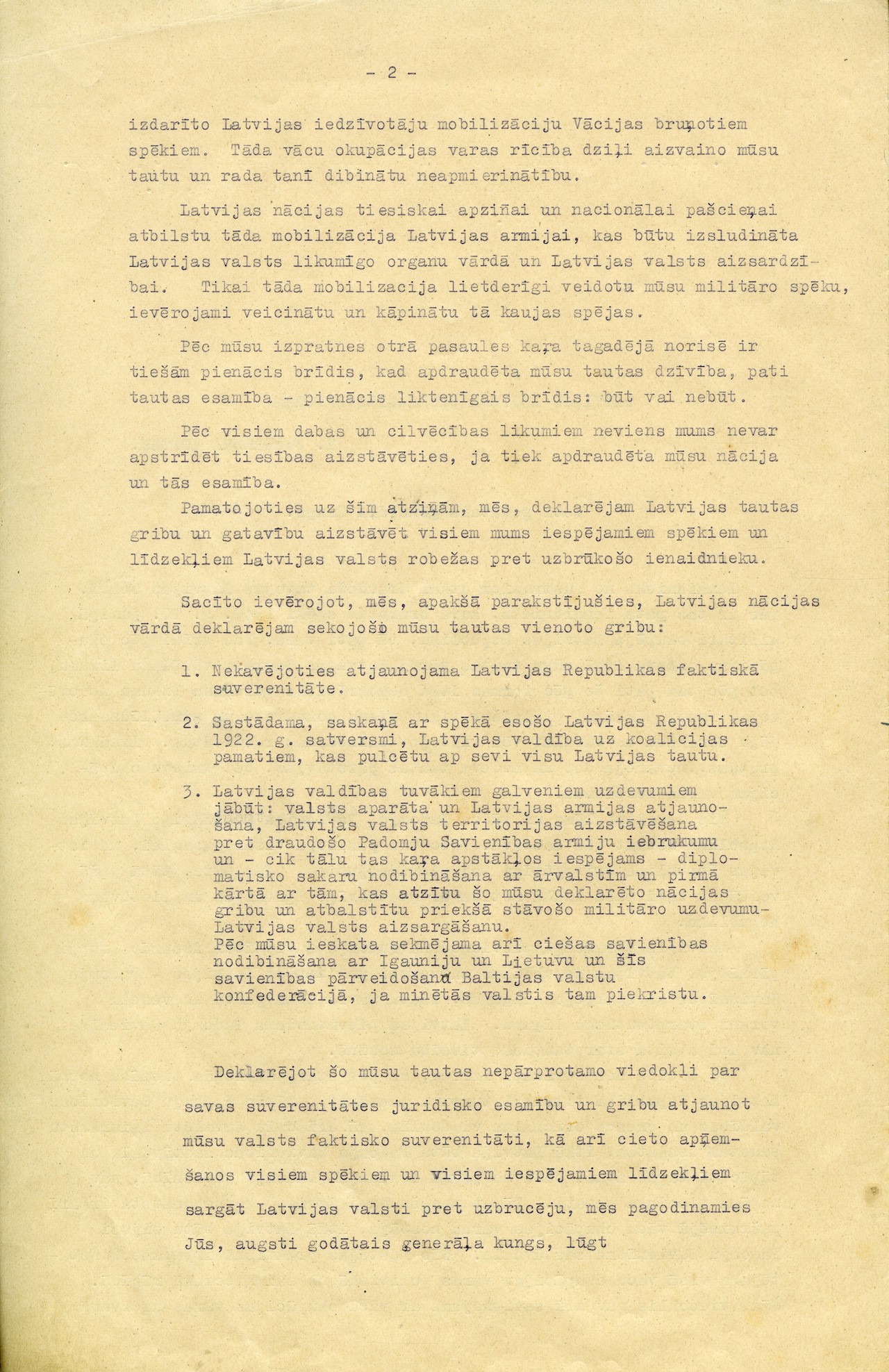 This document is a bold statement of the political platform of Latvian Central Council, the most important organisation of resistance movement, and shows the commitment of its supporters to fight for the freedom and independence of the Republic of Latvia, despite of two totalitarian occupation regimes – Soviet Union and Nazi Germany – making efforts to take it away. At this point, the destiny of Latvia was similar to other East European countries, which during World War II experienced two occupation regimes. Even today this fight for the freedom is sometimes declared as support for one or the other occupation regimes. LCC Memorandum provides a documentary proof that this approach is wrong.