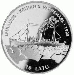 Krišjānis Valdemārs'↗ maritime namesake appears on the Latvian 10 Lat coin commemorative coin issued August, 1998. From the central Latvia Bank↗ site: