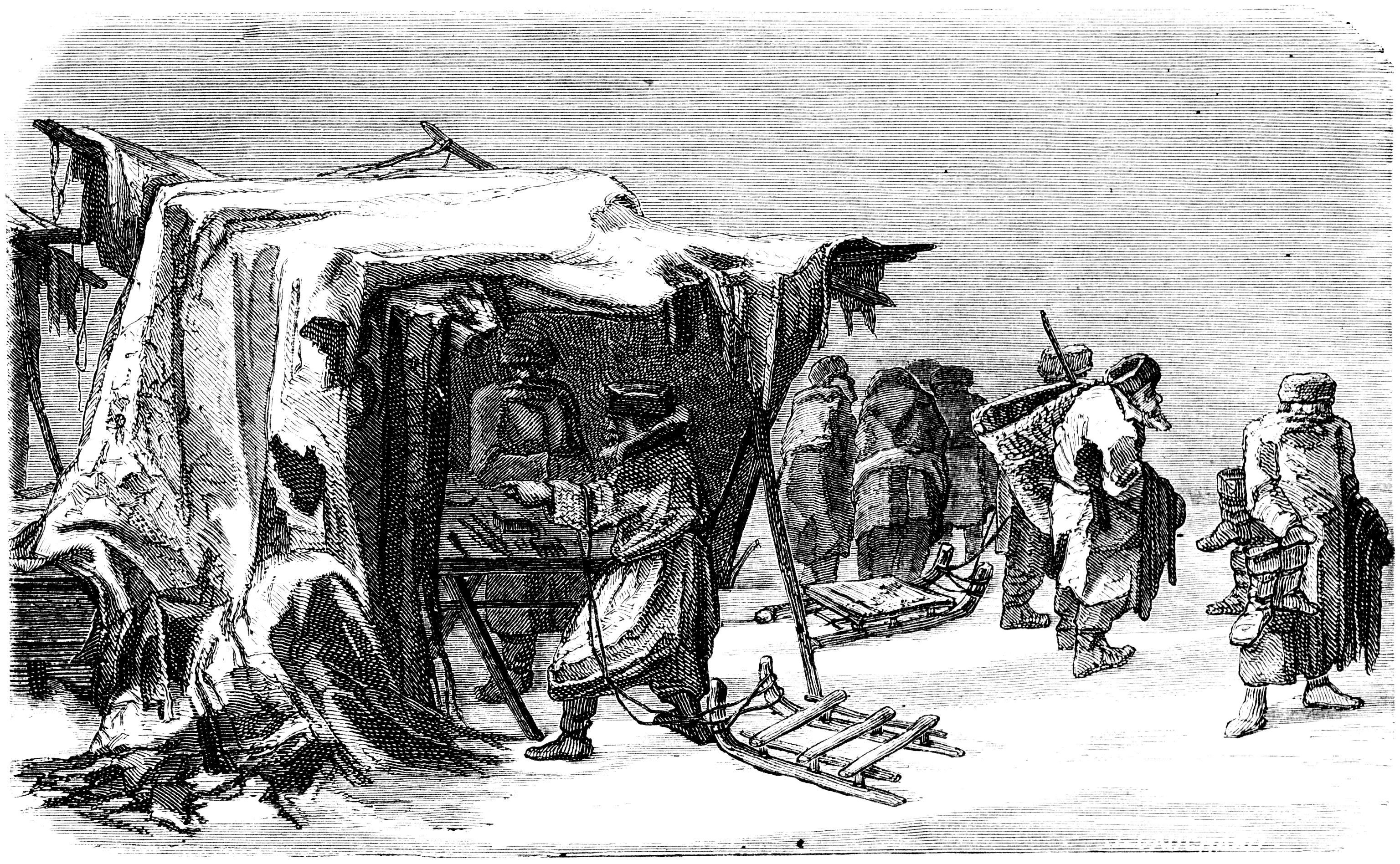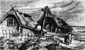 "Black people"6 and "black rooms" are the common names for the Russian peasants and their habitations. These houses are built of logs or rough boards, the cracks stuffed with moss, and the poorest have neither chimney nor window, except small apertures closed with shutters or oiled paper, through which a little of the smoke escapes, while the larger part settles in soot and grime upon walls and inmates, thus justifying the appellation. Often the house has but one room, with a fourth of the space occupied by the brick stove or oven, the top of which, with its broad, adjacent shelf, is the bed of the family during the cold season-the clothes rarely put off, and a piece of felt their only mattress and covering-while in summer they sleep upon the bench that, divan-like, encircles the apartment, or upon the ground beneath the sky. Sometimes the poultry are kept in the house during the winter, so as to be sure of eggs for Easter; and in the warmth and dirt of the place vermin breed and abound. Almost every family has its bath, a small detached room, with its oven and tubs for water; for bathing is their domestic luxury, and necessary to their religion, since without this purification by steam and scourge they are not admitted to Holy Communion. Indeed, for all Russians the vapor-bath↗ never loses its charm, and they carry it with them wherever they go. Freshfield↗, the recent English traveler in the Caucasus↗, speaks of the delight with which the Cossacks↗ at a lonely post-station, where wood was scarce and expensive, took possession of the bath-house after it had been heated and used by his party. In proof of its salutary effects the Russians point to the Finns, and say that their superiority to the Lapps↗ in size and comeliness is owing to their having learned to employ the vapor-bath.