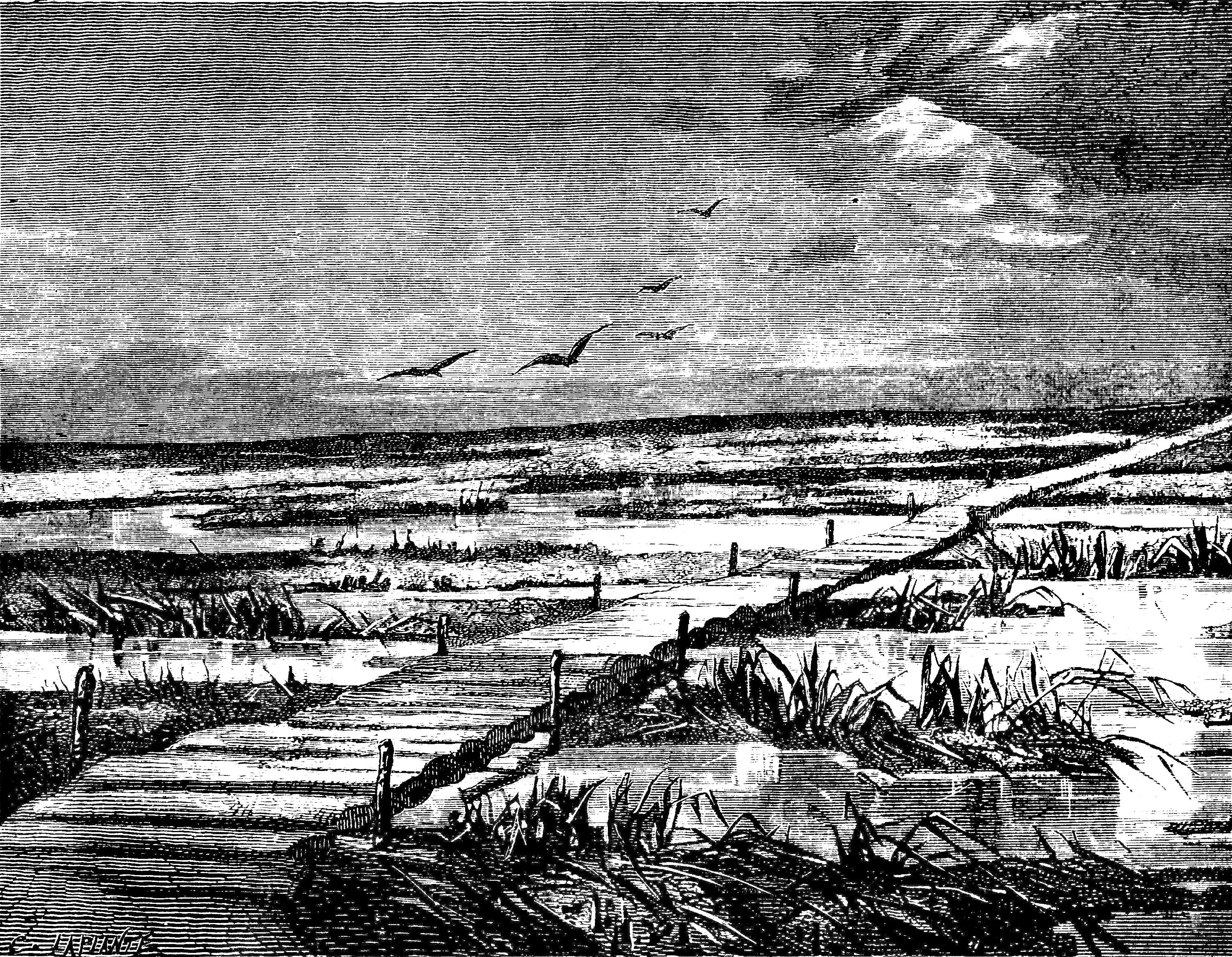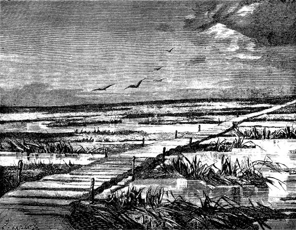 Why did the great Peter [the Great] choose this unpromising swamp for the site of his new town? Because Archangel was inaccessible for nine months of the year; because he wished to approach Europe rather than Asia, and his port on the Sea of Azof↗ being in the midst of Asiatic tribes, the mouth of the Neva was then the most desirable spot on Russian soil. It was in May, 1703, that he began the city by building a small fort on Vassili Island↗, one of the cluster of islands in the delta of the Neva. The poor Finns of the newly acquired district, prisoners of war, and thousands of peasants from the remote regions of the Empire, were drafted to transform the malarious marsh into a spot habitable for man. Multitudes died yearly from the effects of exposure, of the severity of the climate, and of superstitious fear; for the ruling priests and monks abhorred Peter's innovations, and represented his new city to the people as "one of the mouths of hell." But steadily the work went on. Forests were buried in the mud; the soil was drained and raised; a certain proportion of the inhabitants of other towns were compelled to make it their abode; and, as when St. Mark's↗ was building, every vessel leaving Venice↗ for the East was obliged to bring back marbles and pillars for the cathedral, so for years no ship or cart could come to Petersburg without bringing