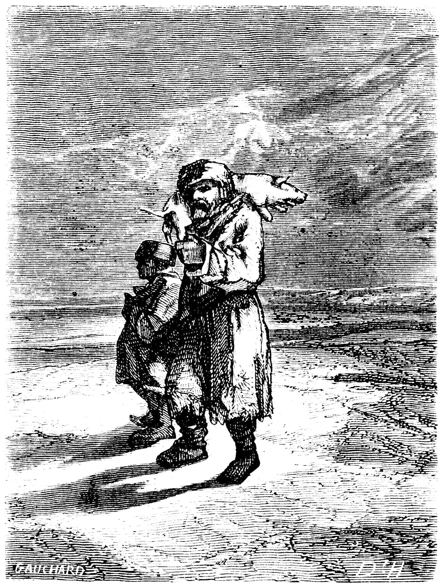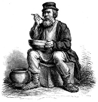 The most common articles of food are rye bread, fish or cabbage soup, salted cucumbers, caviare made from the roes of the sturgeon, with onions or garlic flavoring almost every dish. Meat is more rarely eaten, and even if they could obtain it the Church fasts prohibit it for over a third of the year. So rigidly are these fasts kept, that among the orthodox neither lard nor butter nor milk nor eggs are used, and many even avoid sugar because it is clarified with blood, and take honey in its stead; while for olive oil, too expensive to be commonly employed, hemp-seed oil is substituted, which when fresh is sweet and palatable. The favorite beverages are tea (decoctions↗ of various herbs and pepper-water sweetened with honey are used when Chinese tea cannot be procured); Yuass↗, a fermented liquor made by pouring boiling water on to black bread, or rye or barley meal; and vodky↗, the whisky of the country. Drunkenness is their especial vice; but intoxication never makes them quarrelsome — they sing, they embrace each other, they sit in a stupid maze, but they do not fight or rave — and it is so common, even among the priests, that little disgrace attaches to it.
