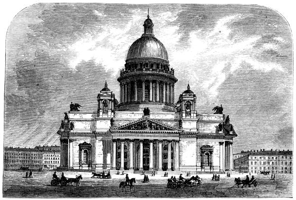 The finest place in the Square is occupied by the glory of Russian churches, the Cathedral of St. Isaac↗. A church had always stood upon this site, but the Emperor Alexander I.↗ resolved to erect one here which should rival the famous cathedrals of western Europe. Begun in 1819, it was completed and dedicated with great solemnity in 1858. Seventy millions of dollars are said to have been expended upon it, no small portion of which was employed in making the ground solid with piles, and in gilding the domes with ducat-gold. Built of red Finland granite, in the form ofa Greek cross, its four equal sides are adorned with porticoes copied from the Pantheon↗, but of grander proportions, their columns being monoliths with a height of sixty and a diameter of seven feet. Similar columns uphold the great central dome, with its glittering cross; four lesser domes surround it, each at an angle of the roof; and the bases and capitals of the columns, and the groups of figures in the pediment, are of darkest bronze; the whole rich and somber in effect — a temple fit to face the Alexander Column, the great monolith of the world. The interior has the same massive