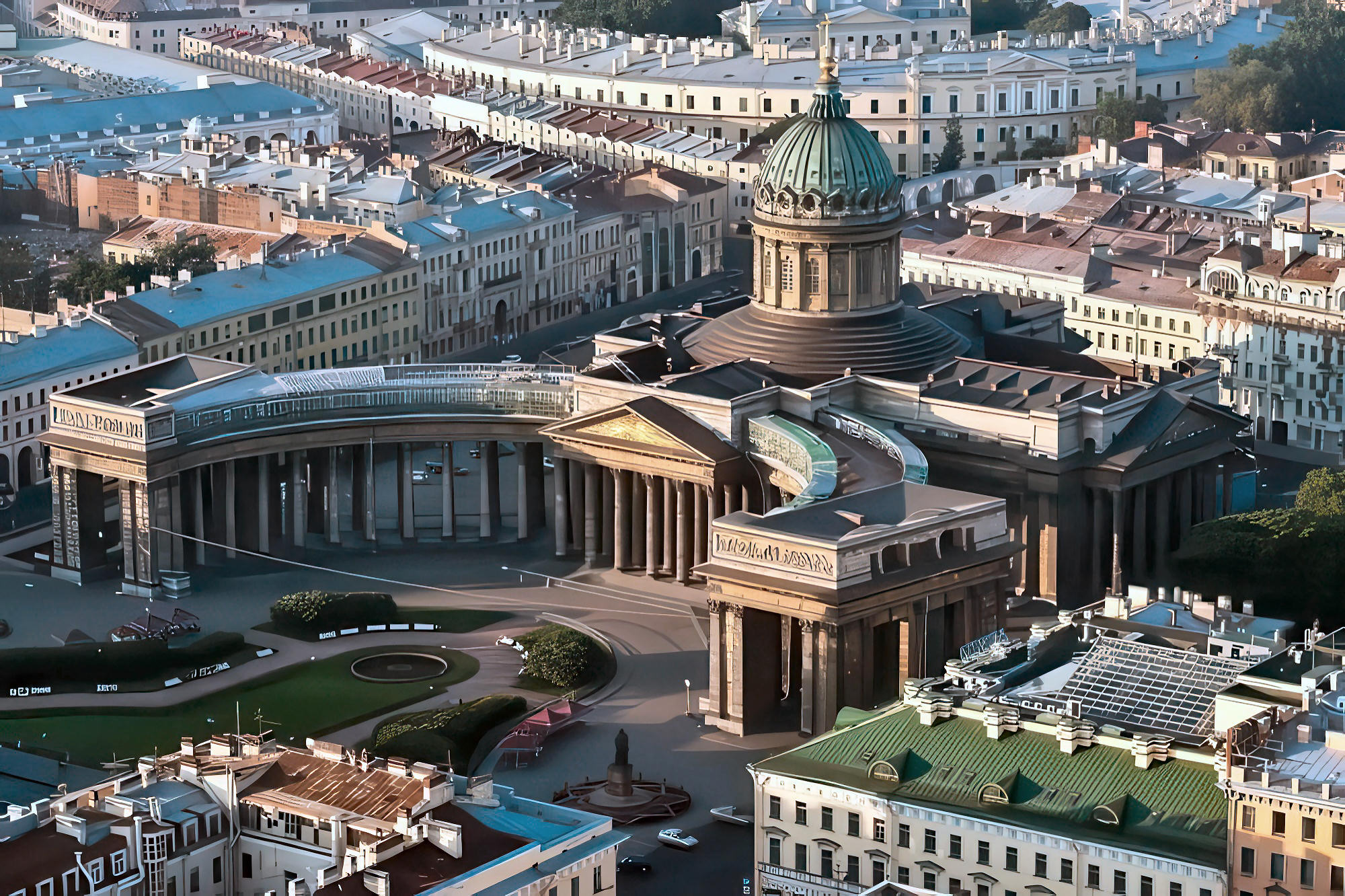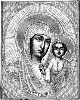 the East, every trade has its quarter. Here is the Kazan Cathedral reared under Alexander I., and called in honor of the image of Our Lady of Kazan↗, which, set in costly stones, adorns the silver screen before the altar. This picture is thought to possess miraculous power, because it was found among the ashes of a conflagration in the old Tartar city whose name it bears. The face is of Southern type, gentle and compassionate, with soft dark eyes. Accurate copies of it are everywhere for sale, and throughout the Empire it is a favorite image. Here, too, is the Imperial Library, with its half-million volumes, and its collection of manuscripts more valuable than any other, unless it be that of the Vatican at Rome.