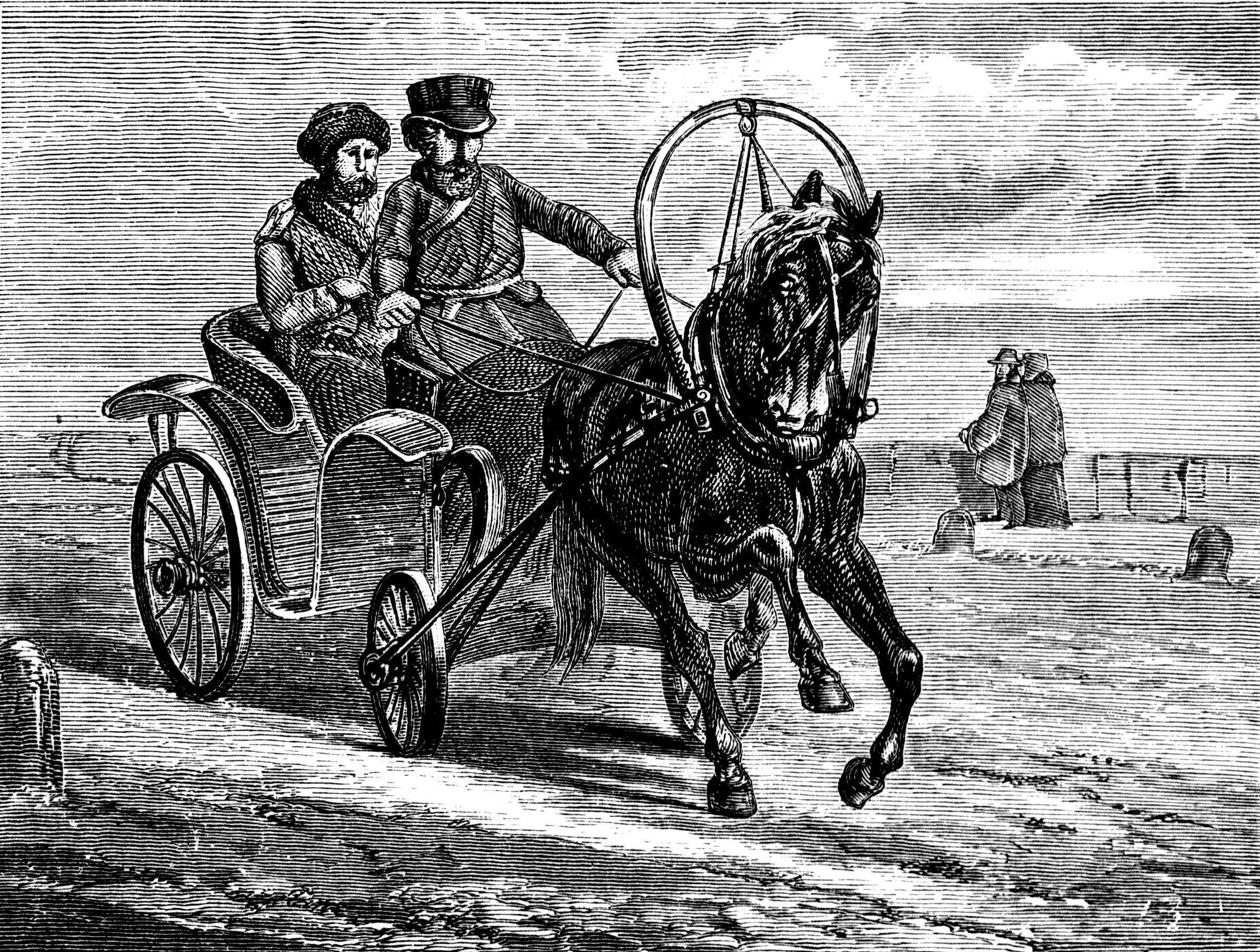 tide of Petersburg life — pedestrians of every nationality of the realm; mounted Cossacks, and officers resplendent with gold lace and orders; elegant barouches, on whose luxurious cushions recline titled ladies borne swiftly to their round of visits or morning drive; troikas, whose two horses trot briskly together, while the third, his head at right angles to them, gallops at the side; droskies, which the Marquis de Custine↗ aptly calls summer sledges, so low and small and convenient are they; policemen; companies of soldiers; groups of peasants; coachmen; porters; beggars; all, with their peculiar attire and strange speech, making up a panorama which you must go to the Neva to behold. Colossal works on every side, power,
