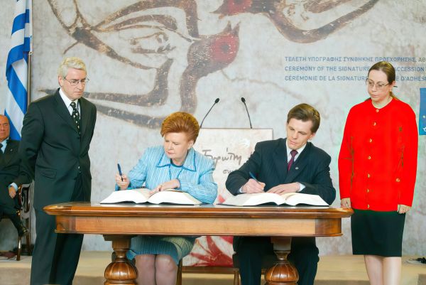 EU accession signing ceremony, April 16, 2004, the President of Latvia Vaira Vīķe-Freiberga↗ and Prime Minister Einārs Repše↗, sign the Treaty of Accession of Latvia to the European Union, via cvce.eu.