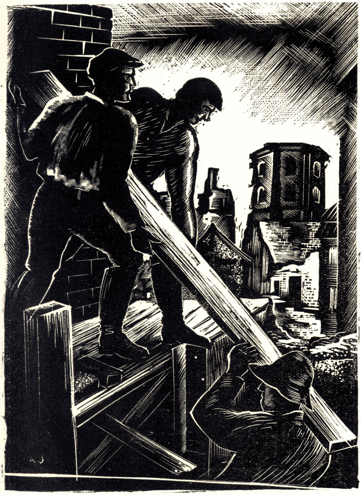 "Workers rebuild Rīga destroyed by the Germans", woodcut by A. Junkers