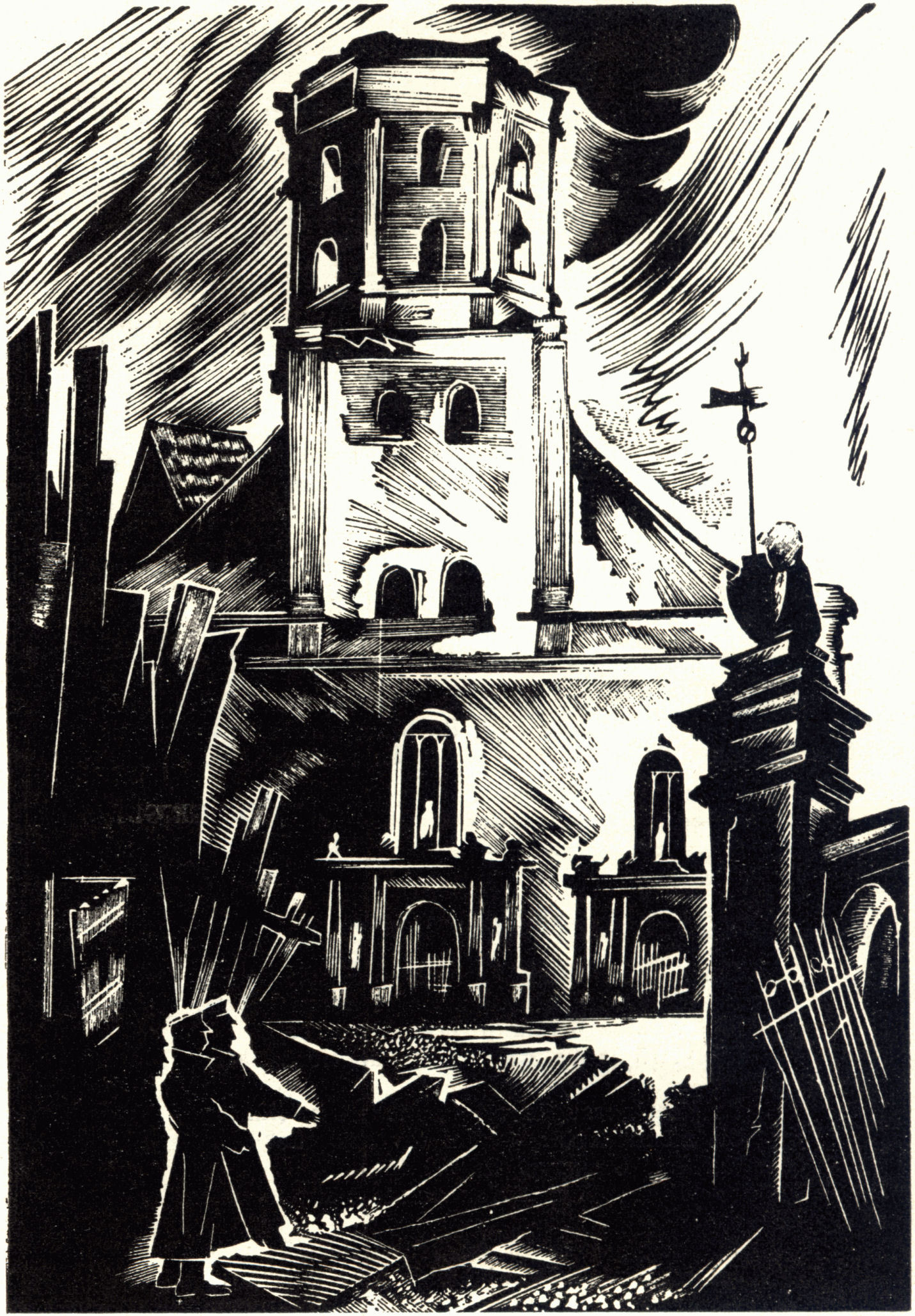 "Destroyed Rīga. German-wrecked Peter's Church," woodcut by O. Ābelītis