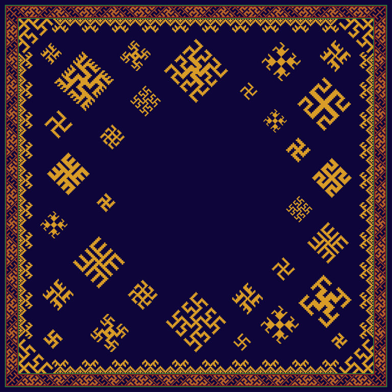 Reproduction of the shawl presented to the Stāmeriene parish in celebration of Latvia's centenary. Rather than being woven, its design featuring 37 swastikas in 20 different variations is fashioned using 6,970 bronze ringlets.