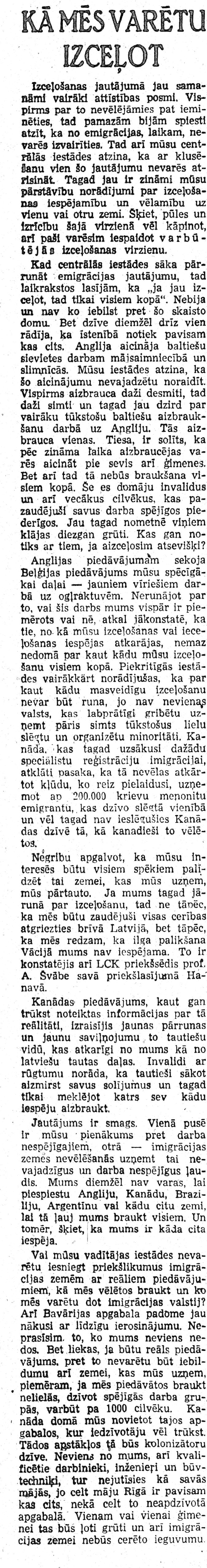 Izceļošanas jautājumā jau samanāmi vairāki attīstības posmi. Vispirms par to nevēlējāmies pat ieminēties, tad pamazām bijām spiesti atzīt, ka no emigrācijas, laikam, nevarēs izvairīties. Tad ari mūsu centrālās iestādes atzina, ka ar klusēšanu vien šo jautājumu nevarēs atrisināt. Tagad jau ir zināmi mūsu pārstāvību norādījumi par izceļošanas iespējamību un vēlamību uz vienu vai otru zemi. Šķiet, pūles un izrīcību šajā virzienā vēl kāpinot, ari paši varēsim iespaidot varbūtējās izceļošanas virzienu.