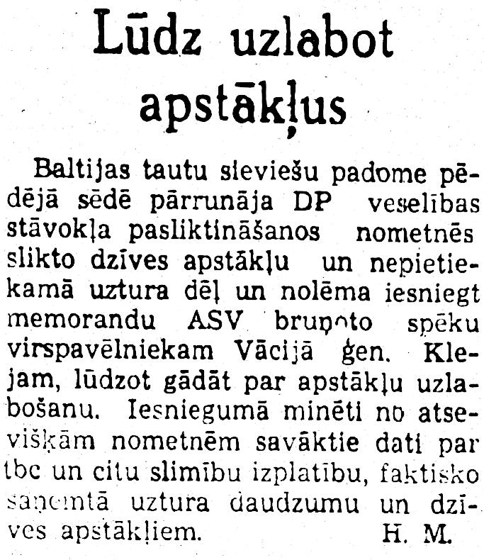 Baltijas tautu sieviešu padome pēdējā sēdē pārrunāja DP veselības stāvokļa pasliktināšanos nometnēs slikto dzīves apstākļu un nepietiekamā uztura dēļ un nolēma iesniegt memorandu ASV bruņoto spēku virspavēlniekam Vācijā ģen. Klejam, lūdzot gādāt par apstākļu uzlabošanu. Iesniegumā minēti no atsevišķām nometnēm savāktie dati par tbc un citu slimību izplatību, faktisko saņemtā uztura daudzumu un dzīves apstākļiem. K. M