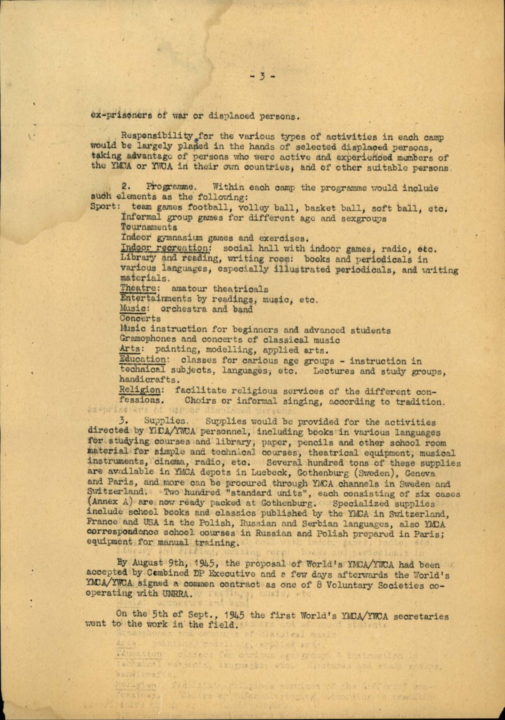 By August 9th, 1945, the proposal of World's YMCA/YWCA had been accepted by Combined DP Executive and a few days afterwards the World's YMCA/YWCA signed a common contract as one of 8 Voluntary Societies cooperating with UNRRA.