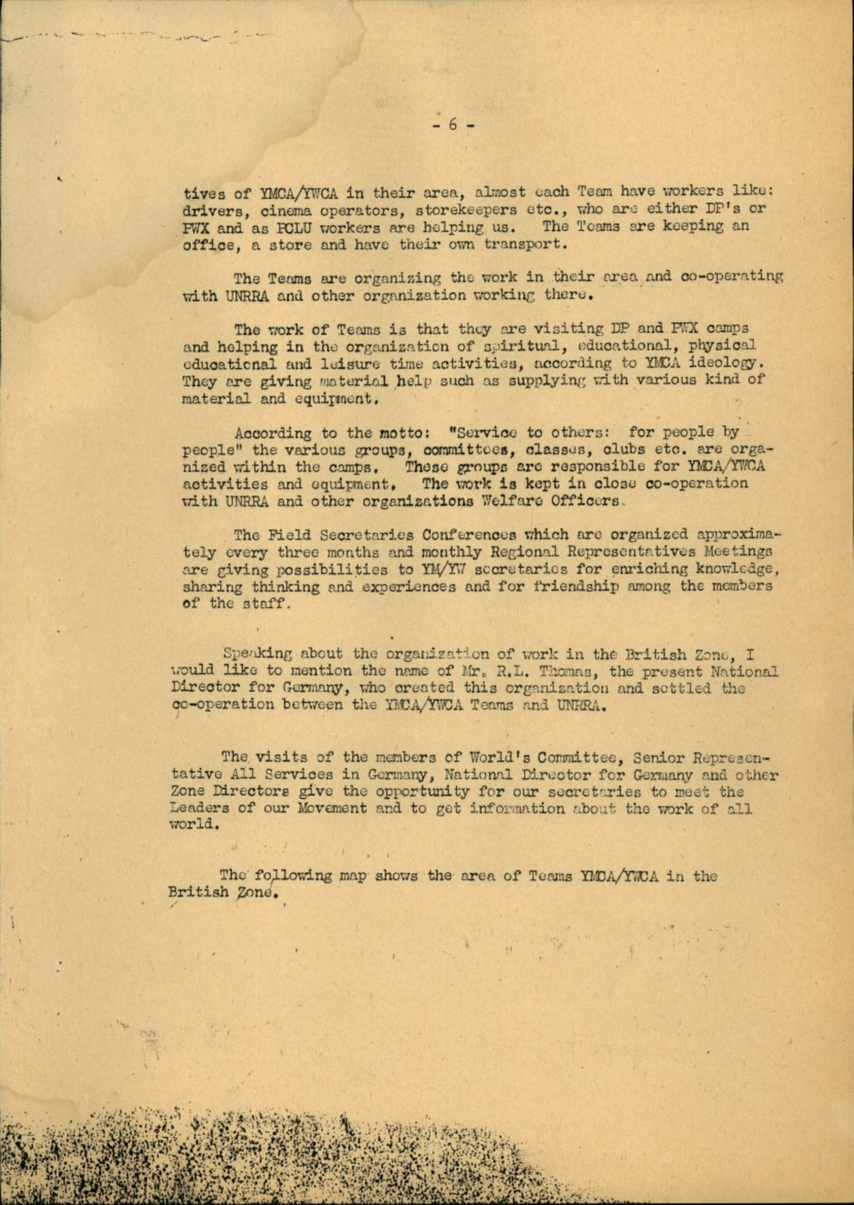 Speaking about the organization of work in the British Zone, I would like to mention the name of Mr. R.L. Thomas, the present National Director for Germany, who created this organization and settled the co-operation between the YMCA/YWCA Teams and UNRRA.
