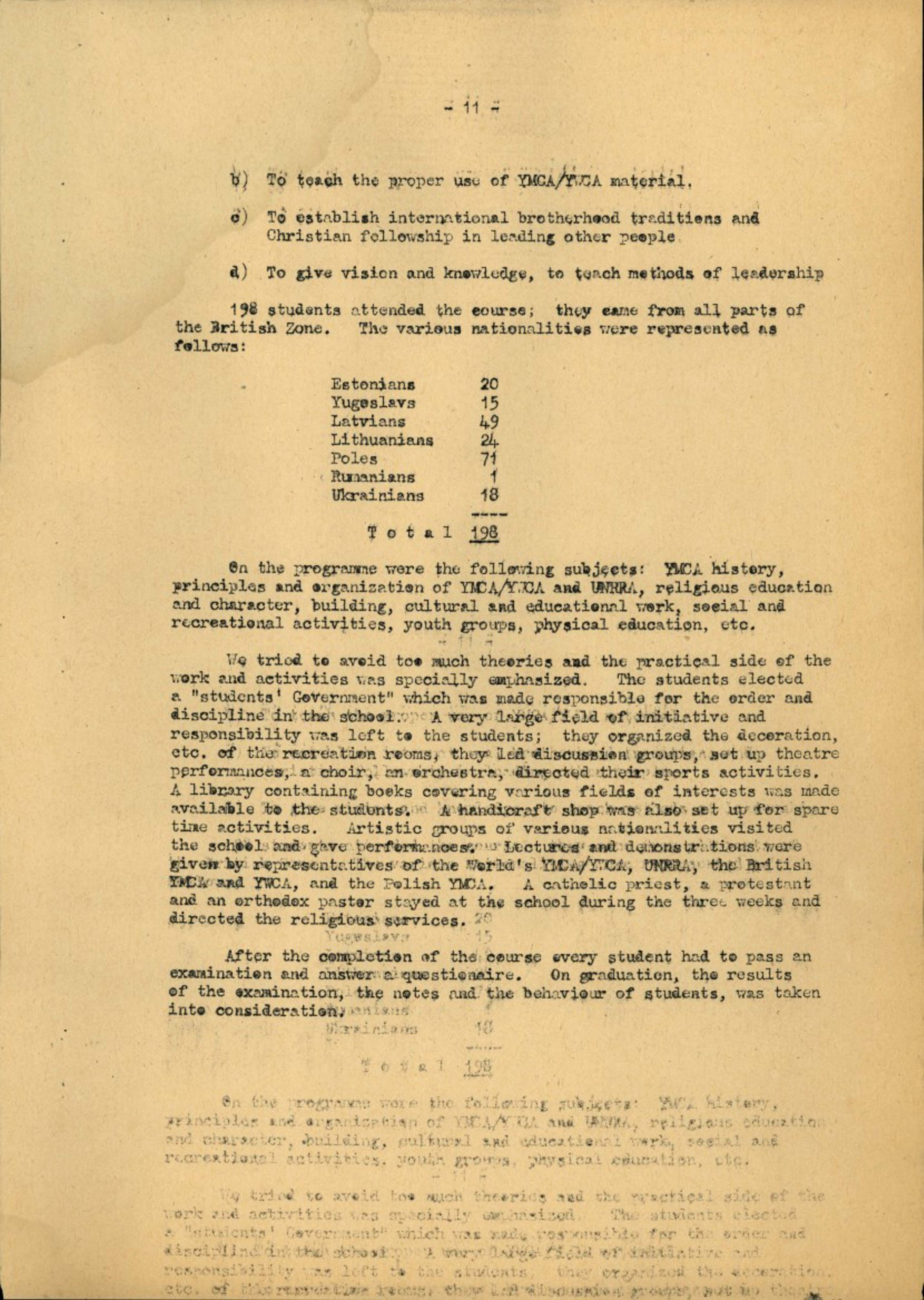 198 students attended the course; they came from all parts of the British Zone. The various nationalities were represented as follows: