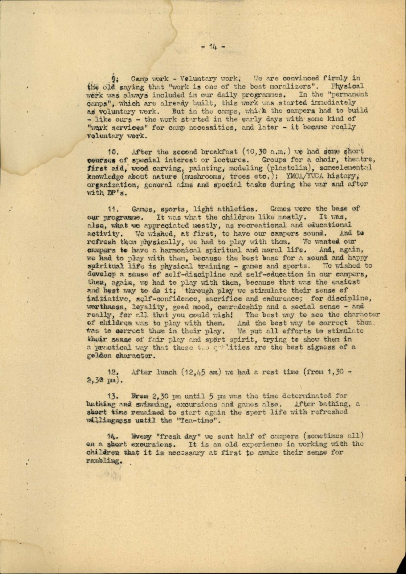 10. After the second breakfast (10,30 a.m.) had some short courses of special interest or lectures. Groups for a choir, theatre, first aid, wood carving, painting, modeling (plastelin), some elemental knowledge about nature (mushrooms, trees etc.); YMCA/YWCA history, organization, general aims and special tasks during the war and after with DP's.