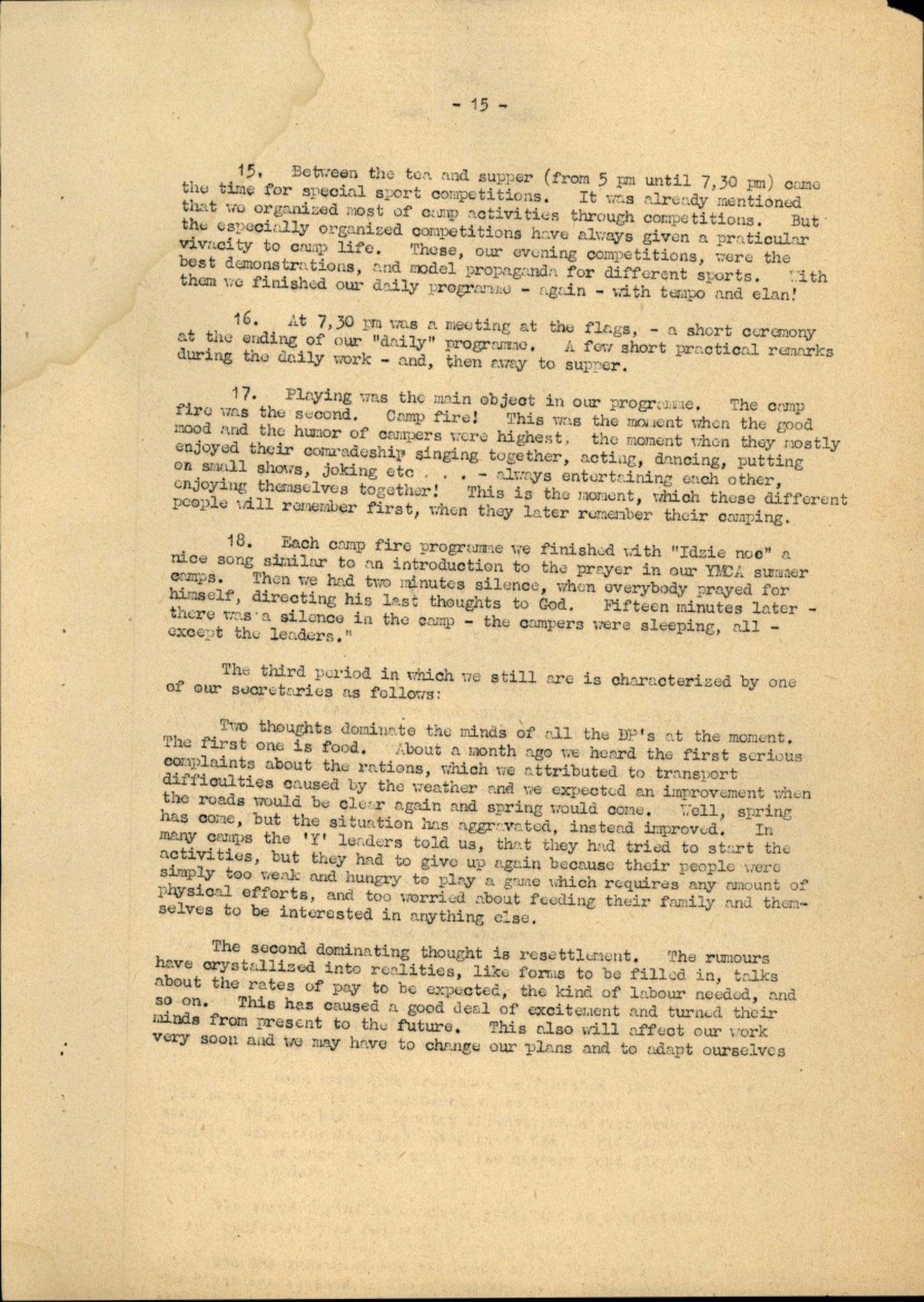 18. Each camp fire programme we finished eith "Idzie noe" a nice song similar to an introduction to the prayer in our YMCA summer camps. Then we had two minutes silence, when everybody prayed for himself, directing his last thoughts to God. Fifteen minutes later -there was a silence in the camp - the campers were sleeping, all -except the leaders."