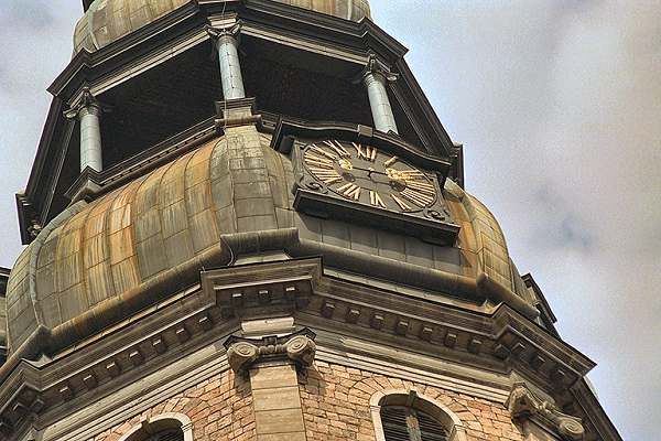 It's somewhere around a quarter to three at St. Peter's in Riga. All the years Peters has taken pictures, he never noticed there's only a hour hand on the clock!