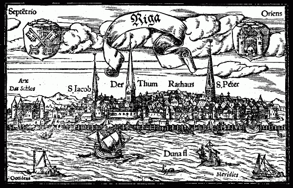Our newest prize possession , a woodcut of the Riga skyline as it appeared in the mid-1500's, taken from the French edition of Sebastian Munster's (1489-1552) Cosmographia printed in the 1580's. It's the opening illustration of an article about the Latvians, which also includies the first publish instance of Latvian: the Lord's Prayer. For nearly a century--Sebastian's son carried on his work--the Cosmographia was the Encyclopaedia Britannica of its day, published in Latin, German, and French.
