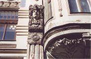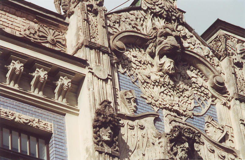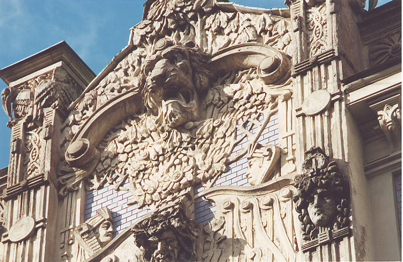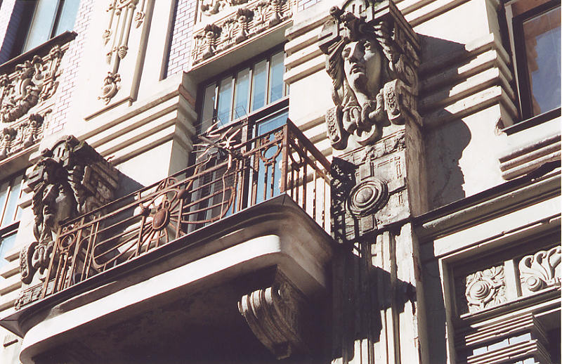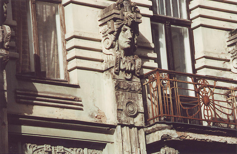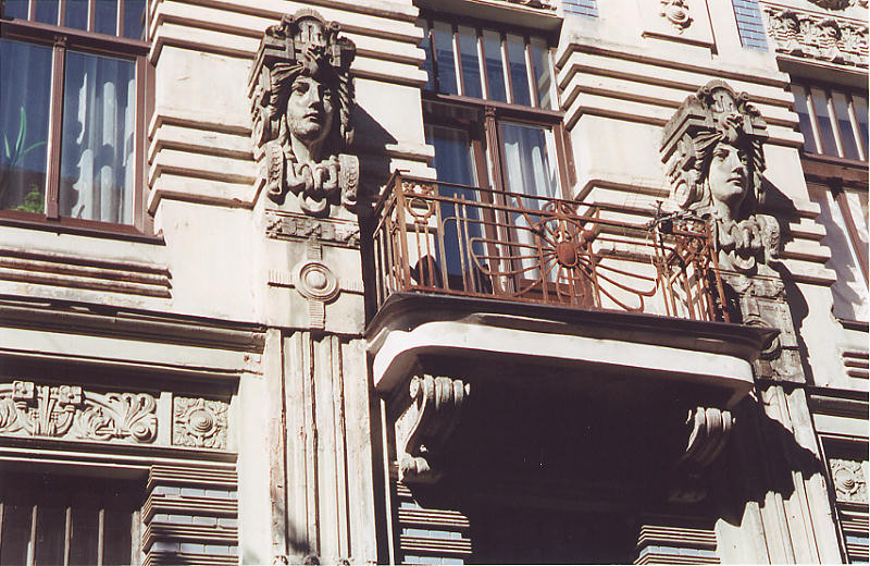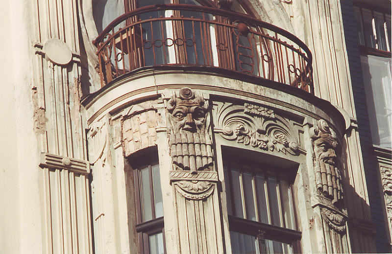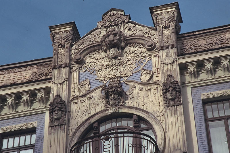 No. 8 Alberta iela is another eclectic Eisenstein architectural masterpiece. The imposing projecting risalit1 comprises the centerpiece of the building, with arboreal and lion motifs. The facade is divided by pilasters topped with female heads2 Window moldings feature monsters keeping the inhabitants safe.