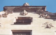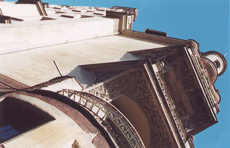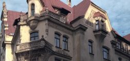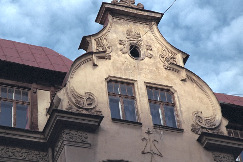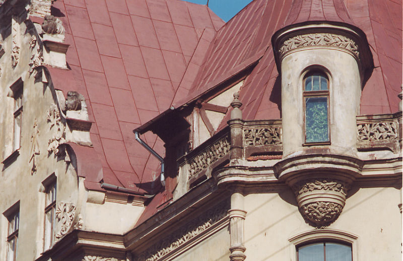 It has a number of prominently projecting risalitas, bay windows, balconies, loggias2, gables, a corner tower and massive entrance portals. The style can best be descibed as an homage to national romanticism. Architectural forms include ornamental reliefs of stylized native plant and animal motifs—cones, needles, squirrels. Apartment windows feature stained glass windows depicting exotic plants. The stairwell features a winding staircase with paintings on the ceiling above. Until 1907 the ground floor contains Pēkšēns personal apratment and workshop. The fifth floor is the painter Janis Rozentāls; and writer Rudolfs Blaumanis' apartment. The museum includes the loft built for the artist's workshop. Rozentāls was the most prominent artist of the Jugendstil period in Latvia. He lived and worked here from 1904 to 1915. The workshop is an authentic representation of the atmosphere of the time.