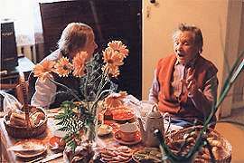 Mom, Gaida, Laura and flowersGaida joins us for a picture at the table. Below, a short pause in the conversation as brunch has continued into dinner. Laura has a new friend in her lap, Ester's cat, Pice. (Ester is Gaida's son's Arno's wife. I promise to put a family tree into one of these albums some day!) Eventually, we finish off the evening with a couple of rounds of coffee - my aunt Laura is the other coffee fiend in the family, though thankfully in lower doses than mine! And I finally head off for a good night's sleep.