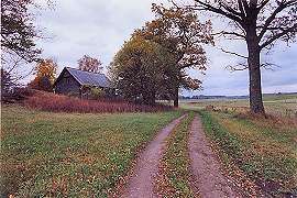Our quest moved on. We found the house where Arturs grew up, "Dravnieki." We follow the road in. The house hasn't changed much. Arturs is reclaiming it because all the land adjoining his current house is being reclaimed, and you need land to grow your own food. Dravnieki was never sold, so he can claim both house and land. Here, the road leading in; my mom in front of the house; Laura and my mom scout the property; the original (stand-alone) cellar, and an old horse-drawn hay rake.
