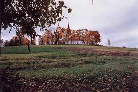 Heading towards AluksneOur visits to the old homesteads complete, we head for Aluksne. Up the hill to our left, the local church peeks out through the half-fallen autumn foliage.