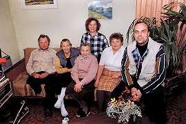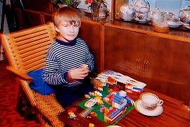 Paraphrasing Samuel Johnson, "The noblest prospect a Latvian can behold is the road that leads him to dinner." Chilled and hungry, I hurry back down the road. Tonight, Ruta would be our hostess. When we arrived, Aris was busy at work with his (new) Lego set. (No, I haven't hit the sauce yet, it only looks that way!) I was sorry to hear his sister Liene was sick in bed. We eat our fill of kotletes, sort of the Latvian equivalent of Swedish meatballs, potatos, lots of gravy, fresh milk, and bread you could use as a boat anchor. After dinner, Laura and my mom spot me trying to catch them chatting, while poor Ciepa (the dog) keeps hoping for scraps from Laura, with no luck. After dessert, we put the table away and gather for a photo. (I didn't mean to be so conspicous, I just couldn't find another seat before the self-timer went off.)