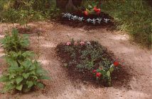 Measurements all done, safely written into my address book so I don't lose loose slips of paper (have I mentioned I'm the Post-It king?), I went out around back to see how Gaida was doing with more planting. These are some of the samples from Mordanga's little flower garden.