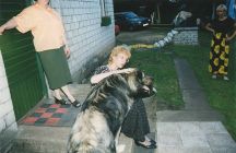 Vecaki, greeted by the big dog, friendly to family; current dog bites his own