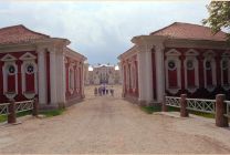 Rundāle Palace, a view towards the palace as we enter between flanking stables