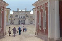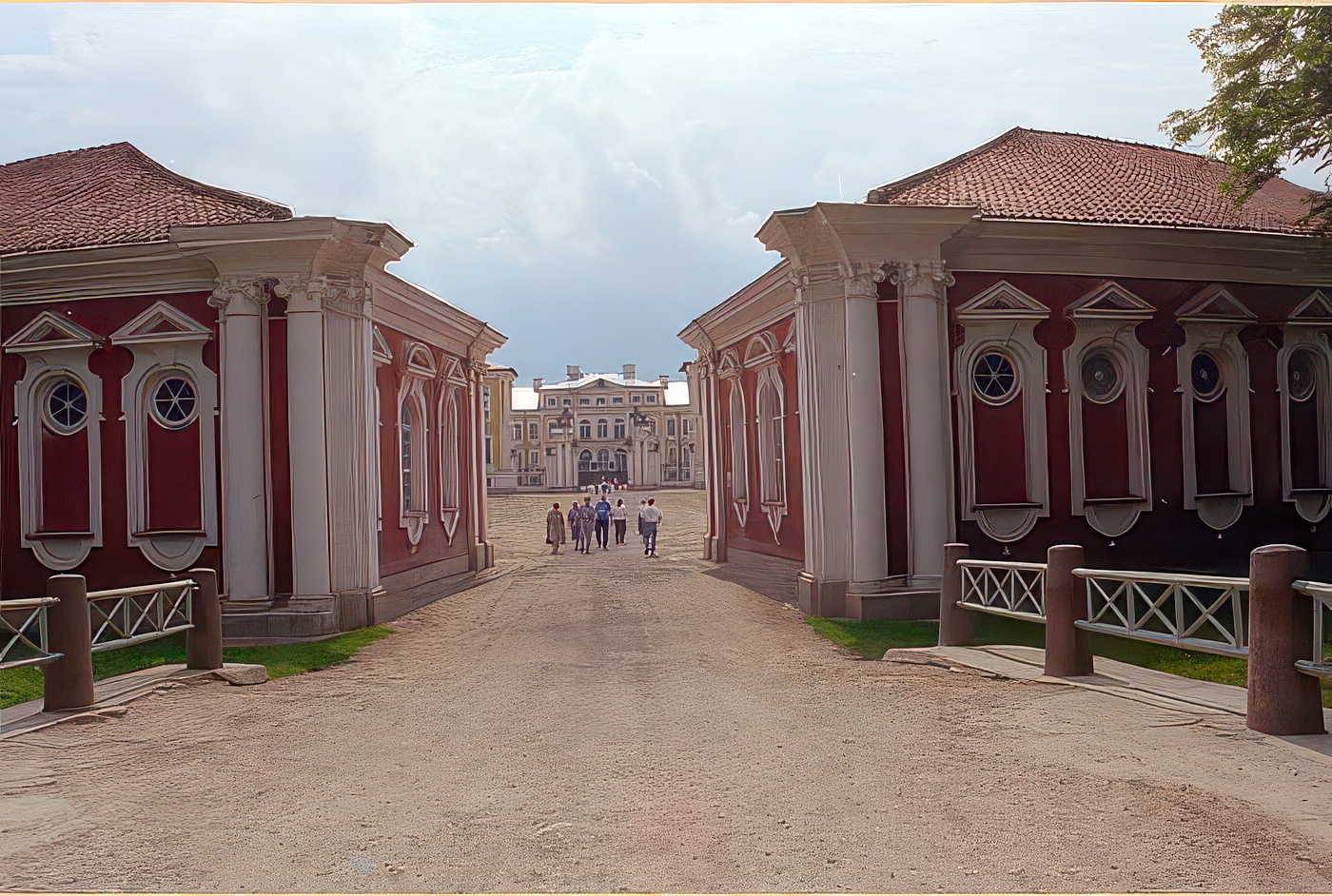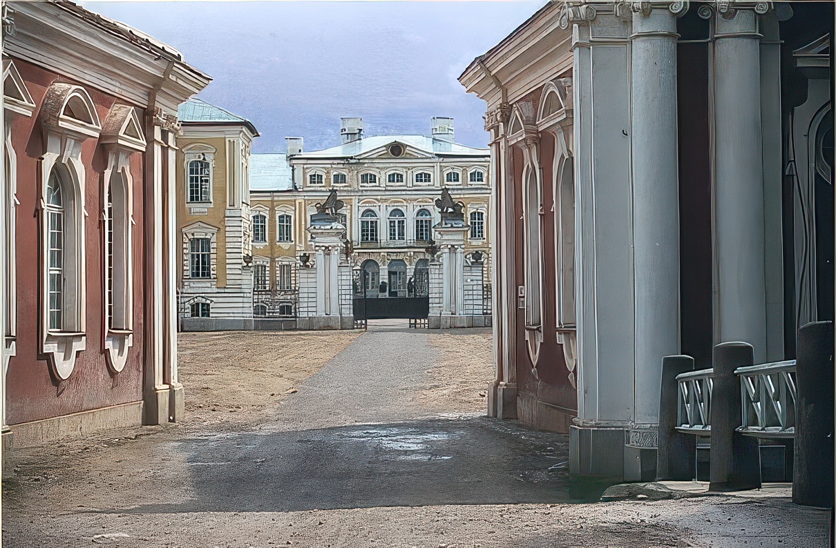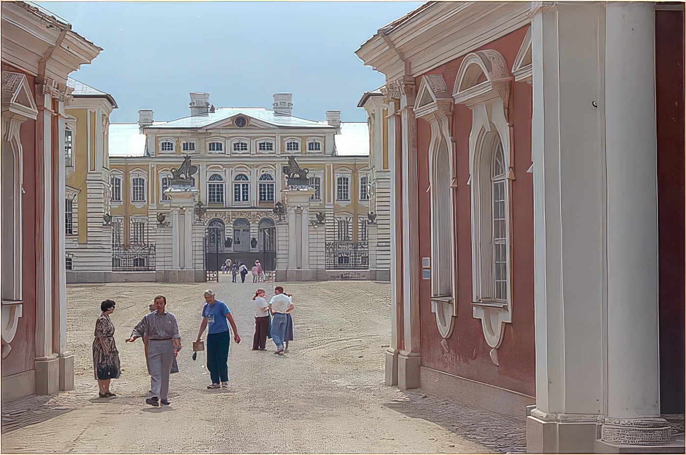 Rundāle Palace, another view through the flanking stables, people added for scale