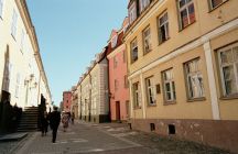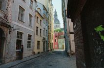 The Daugavas Gatve passes into Old Riga from the boulevard along the Daugava, past one of the massive towers of the Presidential Palace (to the left).
