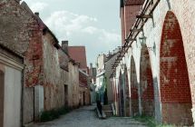 Off the plaza behind St. Peter's Church, the street vendors have already packed up for the "night." In the background is the entrance to Konvent Seta.