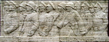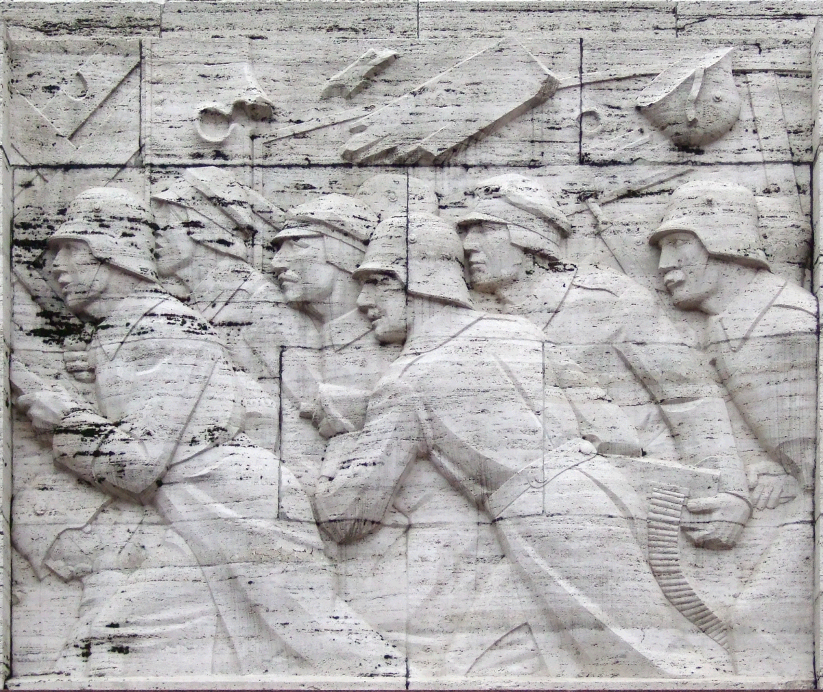 Tēvijas sargi, Guardians of the Fatherland, are at the ready to defend Latvian honor and rights. An ancient warrior grasping his sword stands at center, flanked by soldiers of an independent Latvia, rifle and grenade in hand.