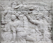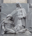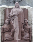 Mother — guardian of the family, Māte — ģimenes sargātāja, is the source of the people's moral strength. She holds an oak leaf garland and drooping palm frond in her right hand, and stands between the next generation, kneeling beside her.