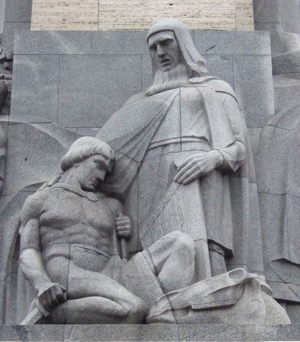 The Heathen priest, Vaidelotis, has sung his song of longings and deeds, one hand on his kokle↗ (Latvia zither), another on the shoulder of a shepherd boy, kneeling at his feet. Before them lies a horse's skull, a witness to the past. The shepherd holds a weapon, readying for battle.