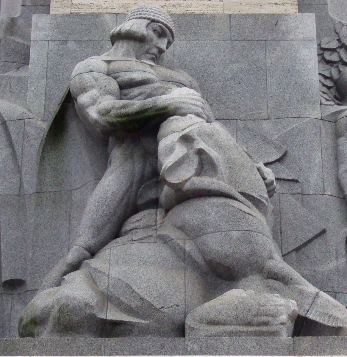 The statue of Freedom, Brīvības tēls, stands heroically atop the monument pillar, holding three stars of Freedom in her uplifted hands, revealing the people's deepest strivings: freedom and the right to build and fulfill their cultural mission. The statue's "Milda" appellation is not original to the monument, and appears to have come from a 1930's cigarette rolling papers brand "Milda," whose packets featured the image of a Latvian folk maiden.