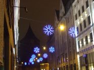 I discover a city decked out for the holidays. The sign by the Christmas tree reads "Sveicam rīdziniekus un novēlam krāšnus svētkus! MAXIMA", We offer our greetings to the residents of Rīga and wish all a resplendent holiday! MAXIMA.
