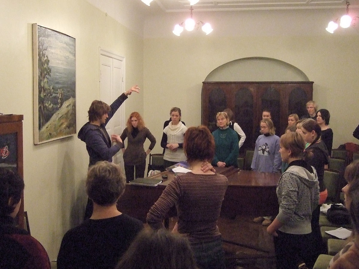 Our intrepid band of singers gathers for the first warm-up and review of our concert materials. Here, members of the New York Latvian Concert Choir and Latvian youth choir Balsis.