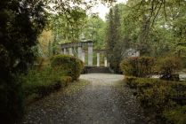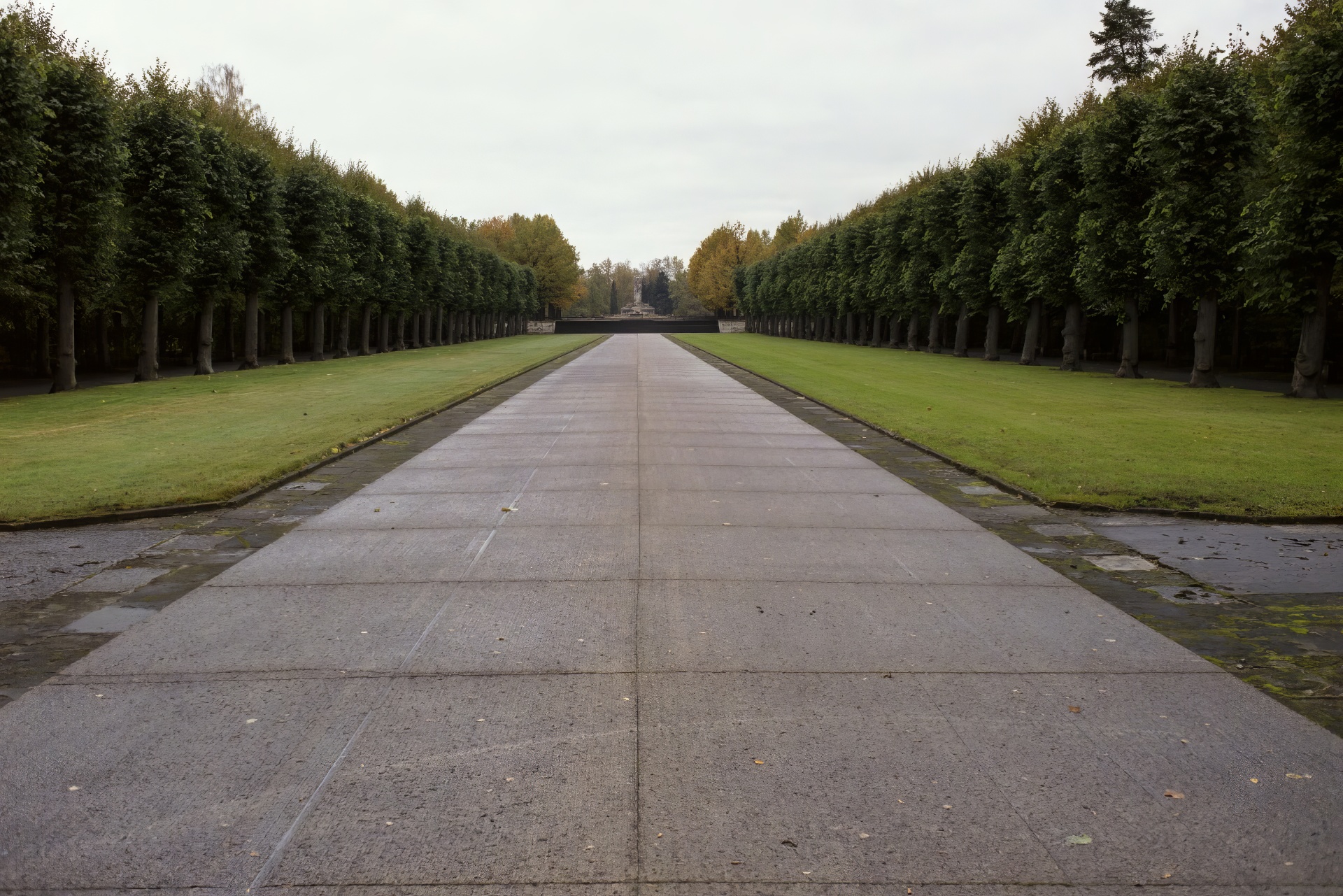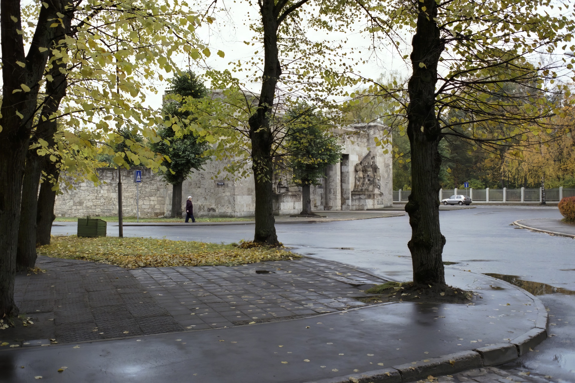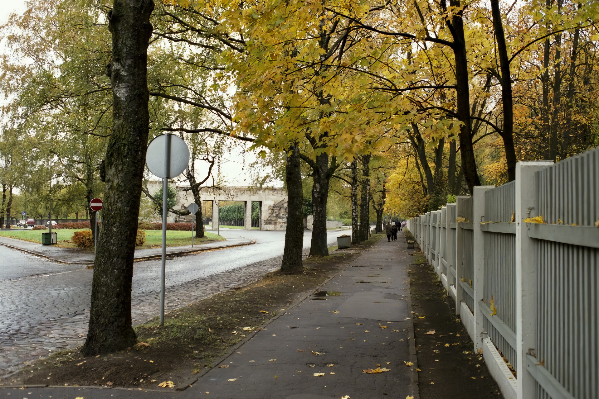 On a dank day, only the groundskeeper is to be seen as we look down the promenade to Rainis' memorial
