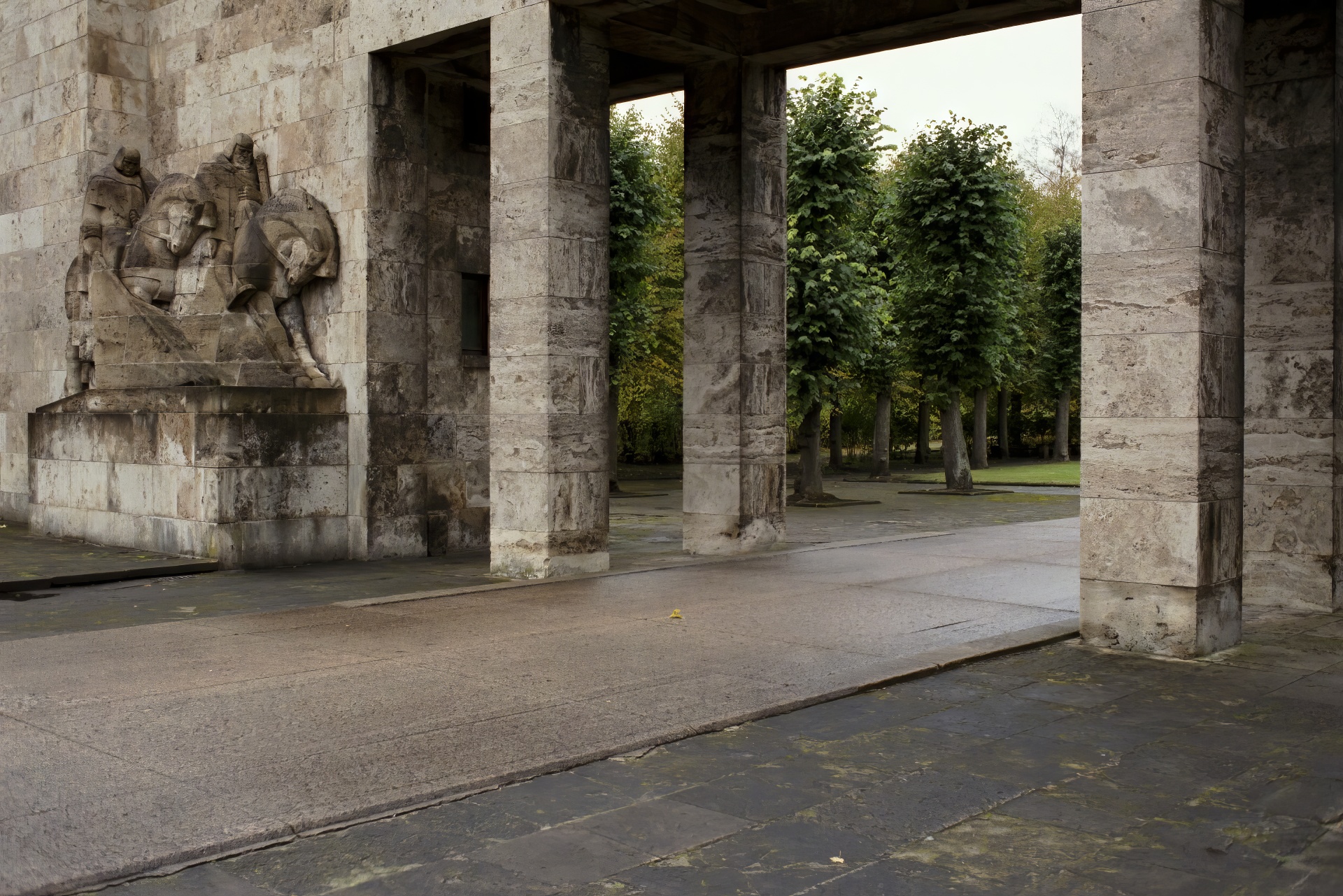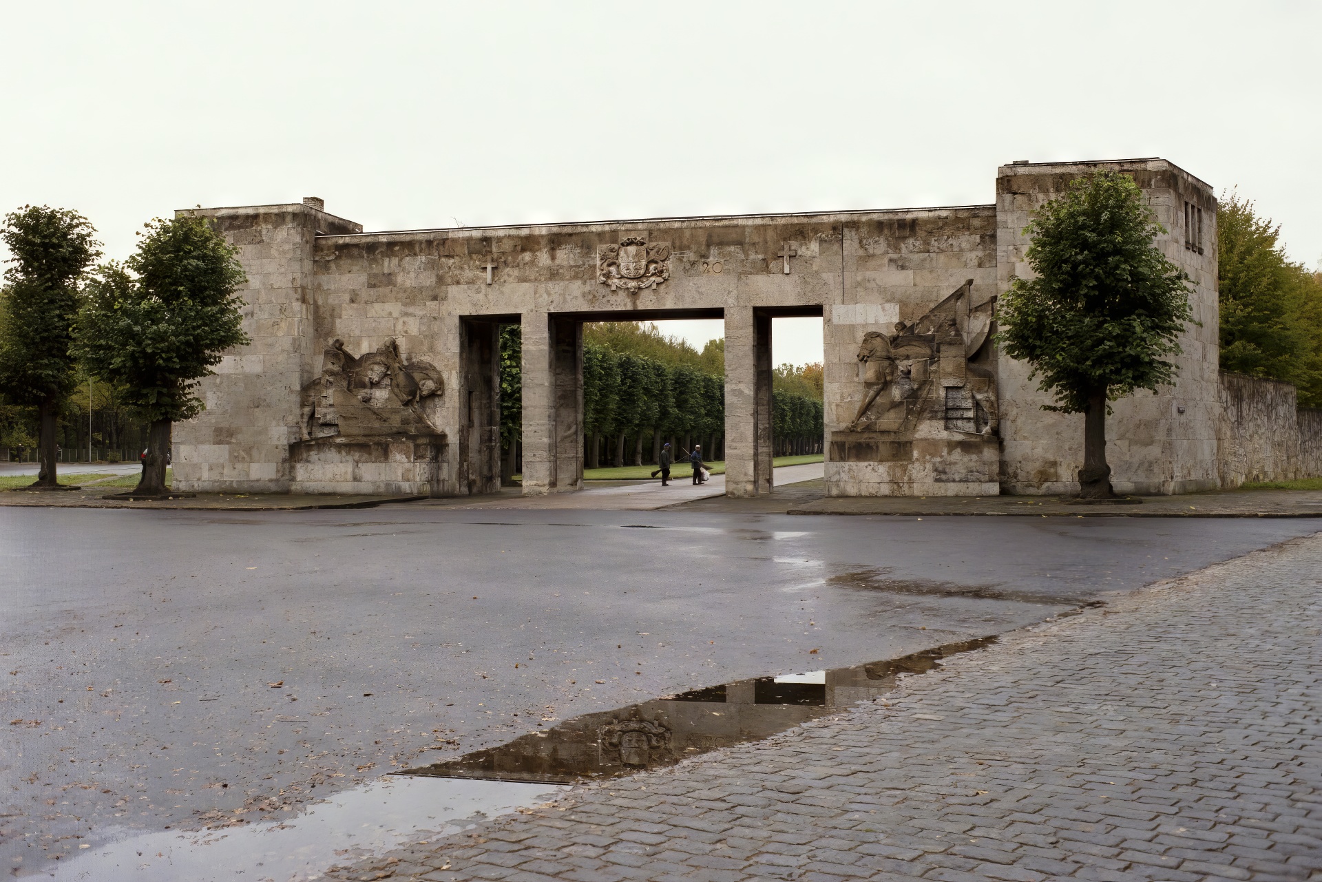 Brāļu kapi entrance, flanked by horsemen on the left