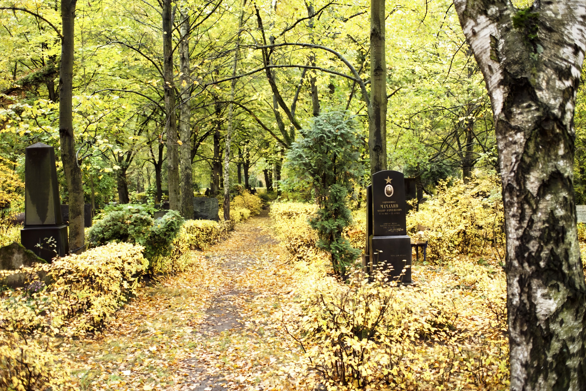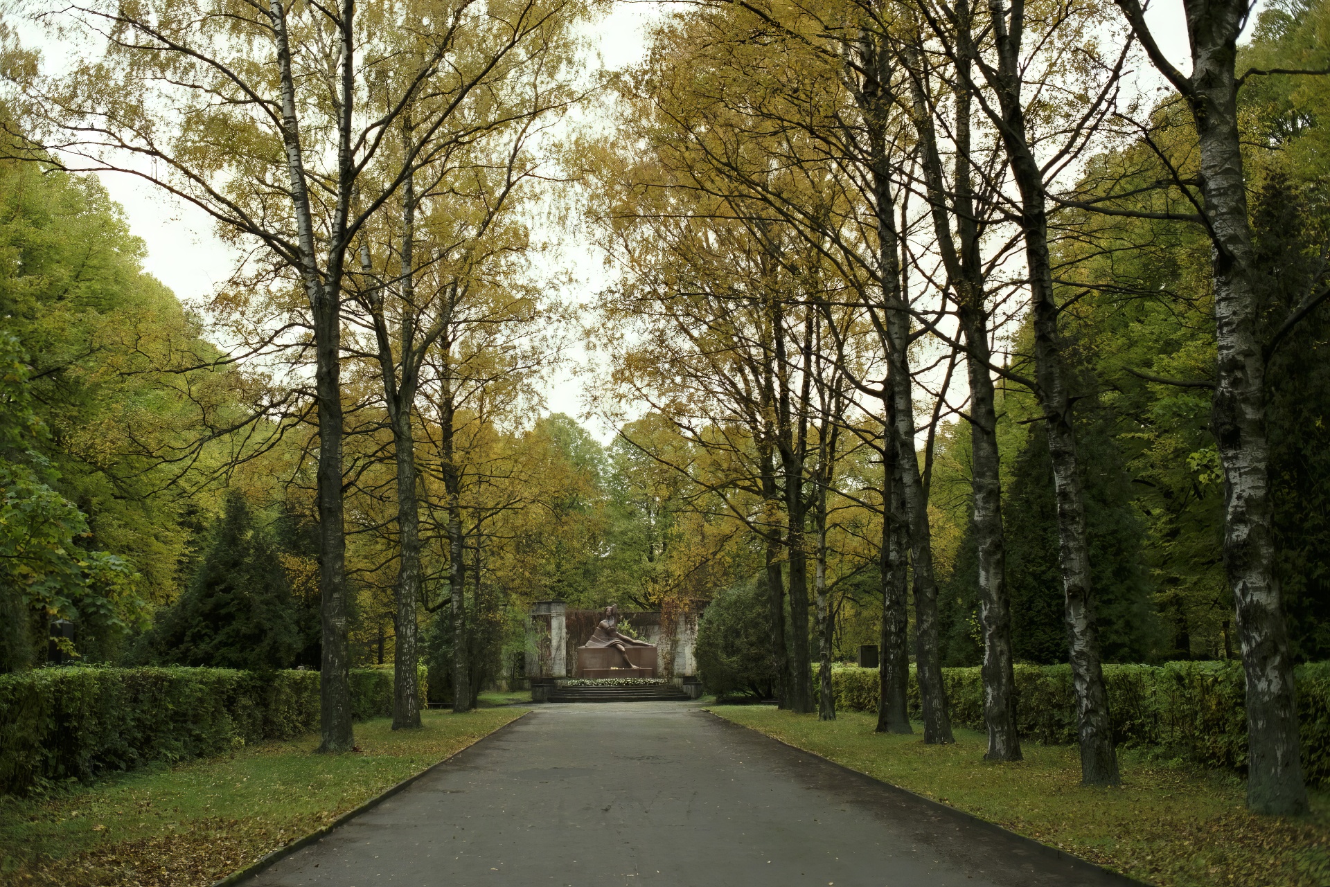 The lawn- and tree-lined promenade leading from the cemetery entrance to Rainis' memorial.