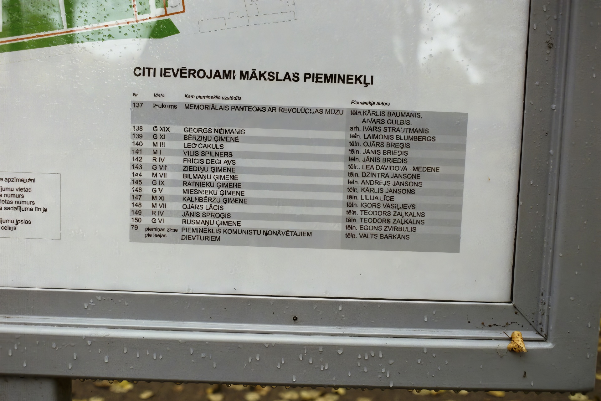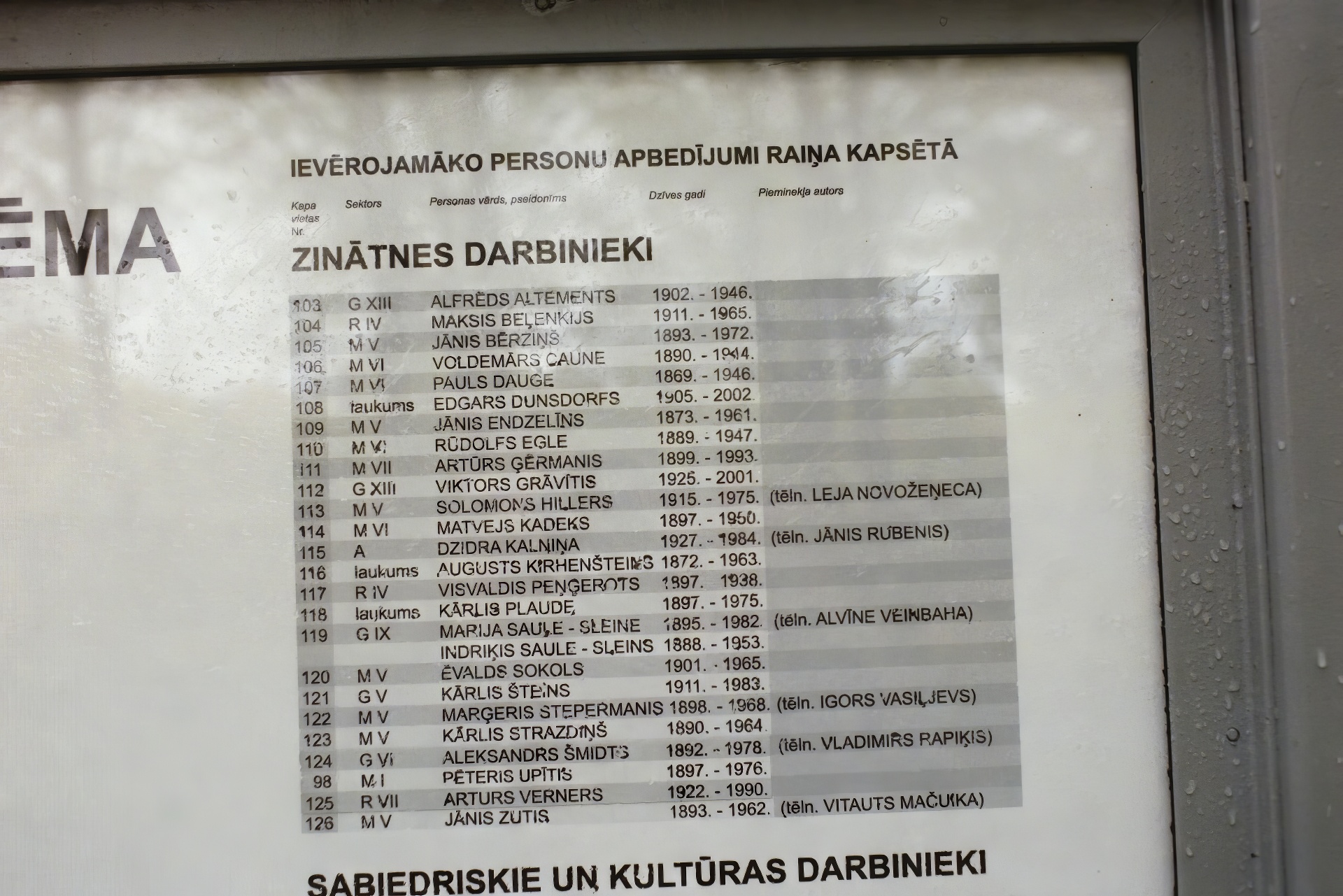 Latvians do not view/avoid cemeteries as some sort of morbid fields of the dead as in America. At the cemetery entrance, a guide and map to the final resting places of notables. RAKSTNIEKI UN DZEJNIEKI are authors and poets.