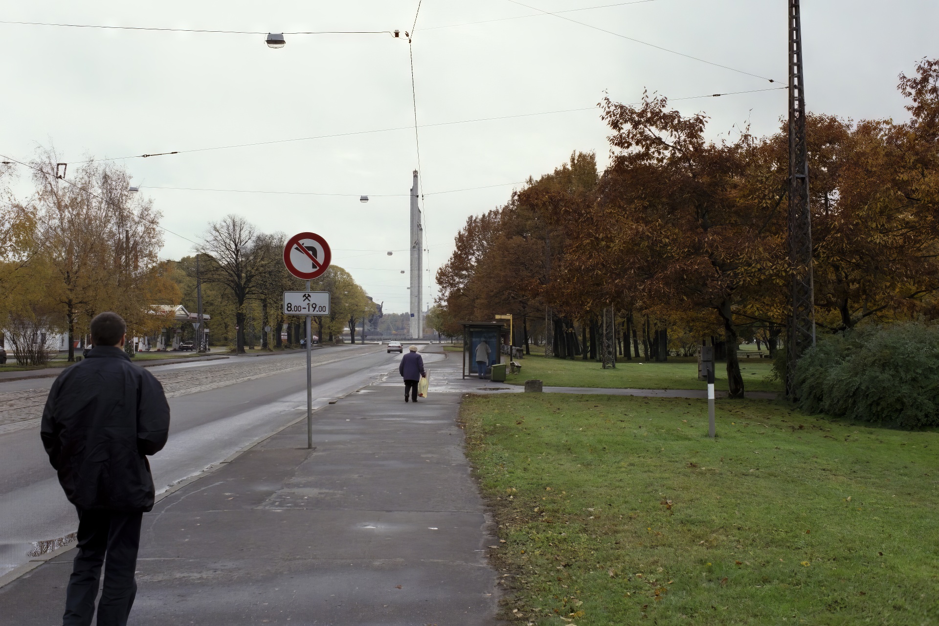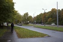 The sidewalk narrows as the tram speeds by, to the left is Rīga's Lielie kapi, Great Cemetery.