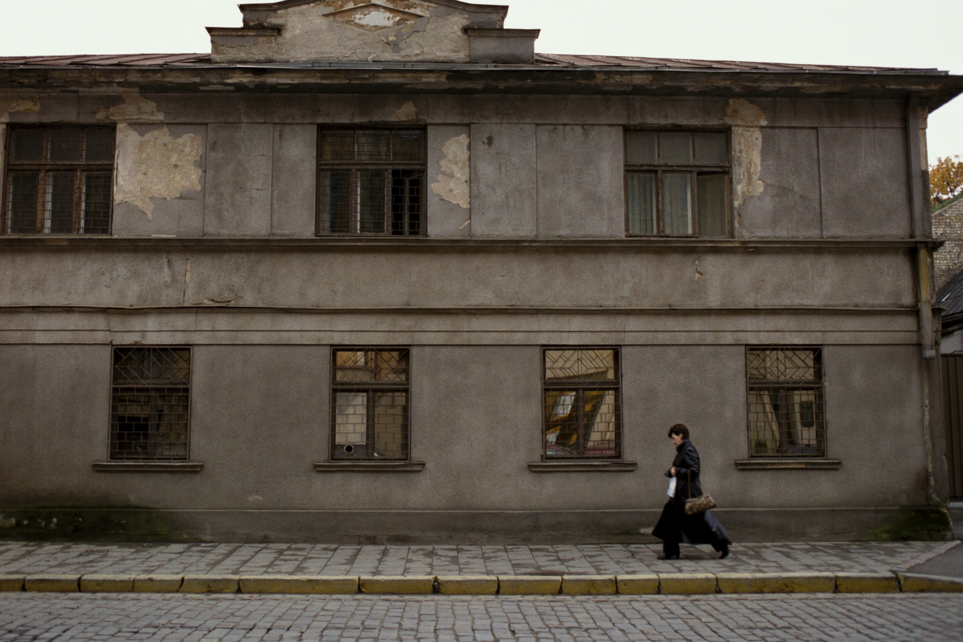 Across the street, Soviet-era apartment blocs.