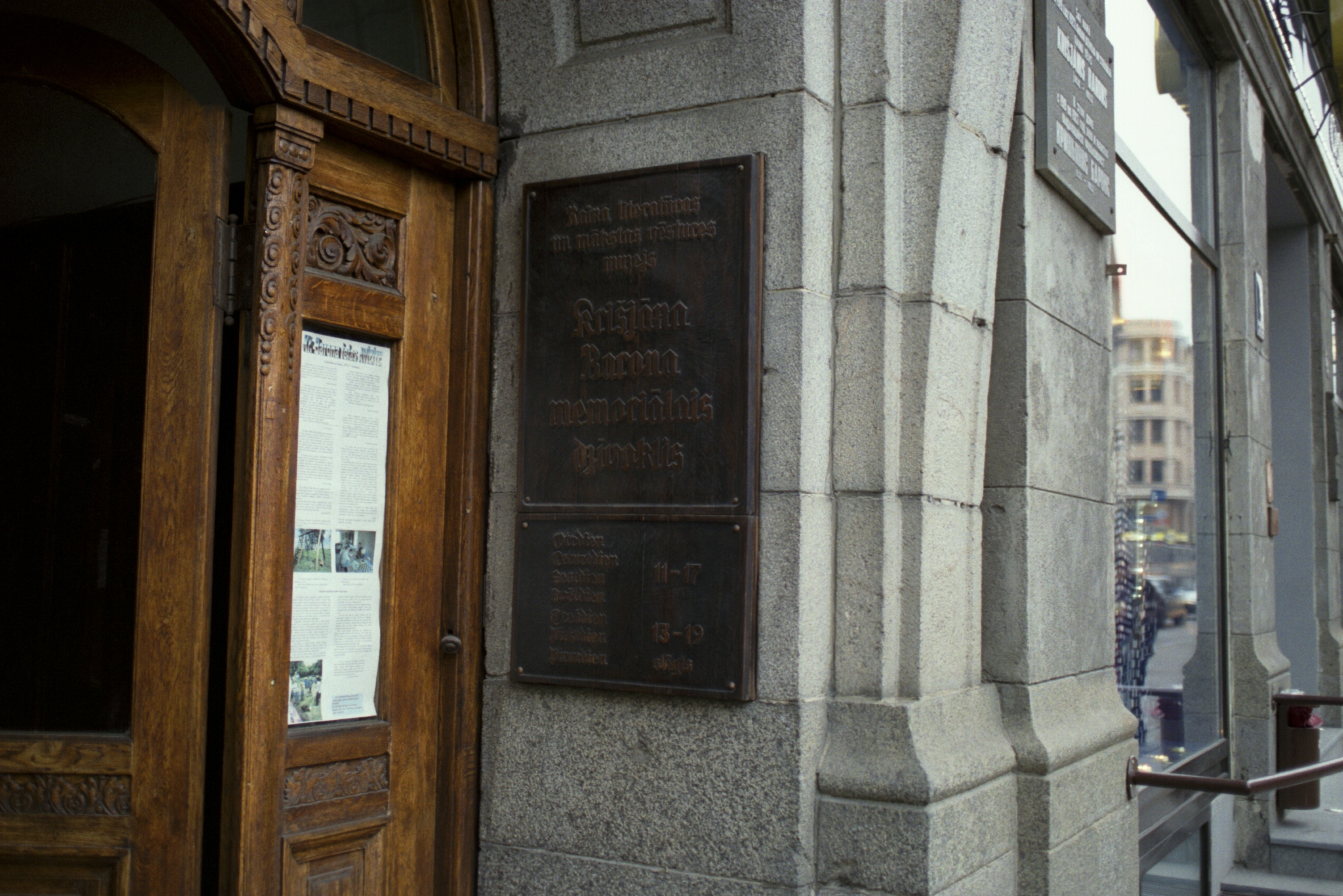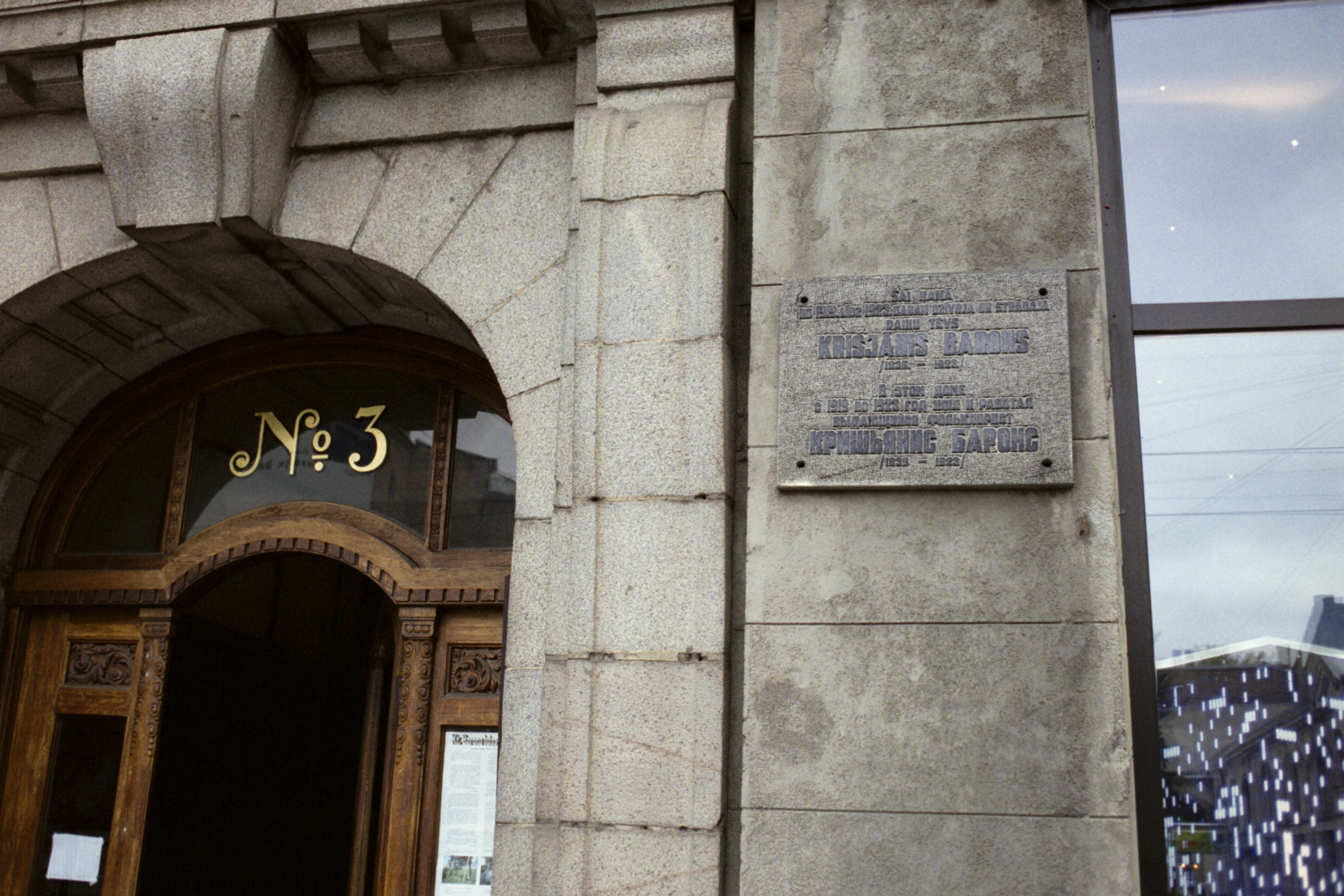Plaque reads that Krišjānis Barons lived and worked at this address from 1919 to his passing in 1923