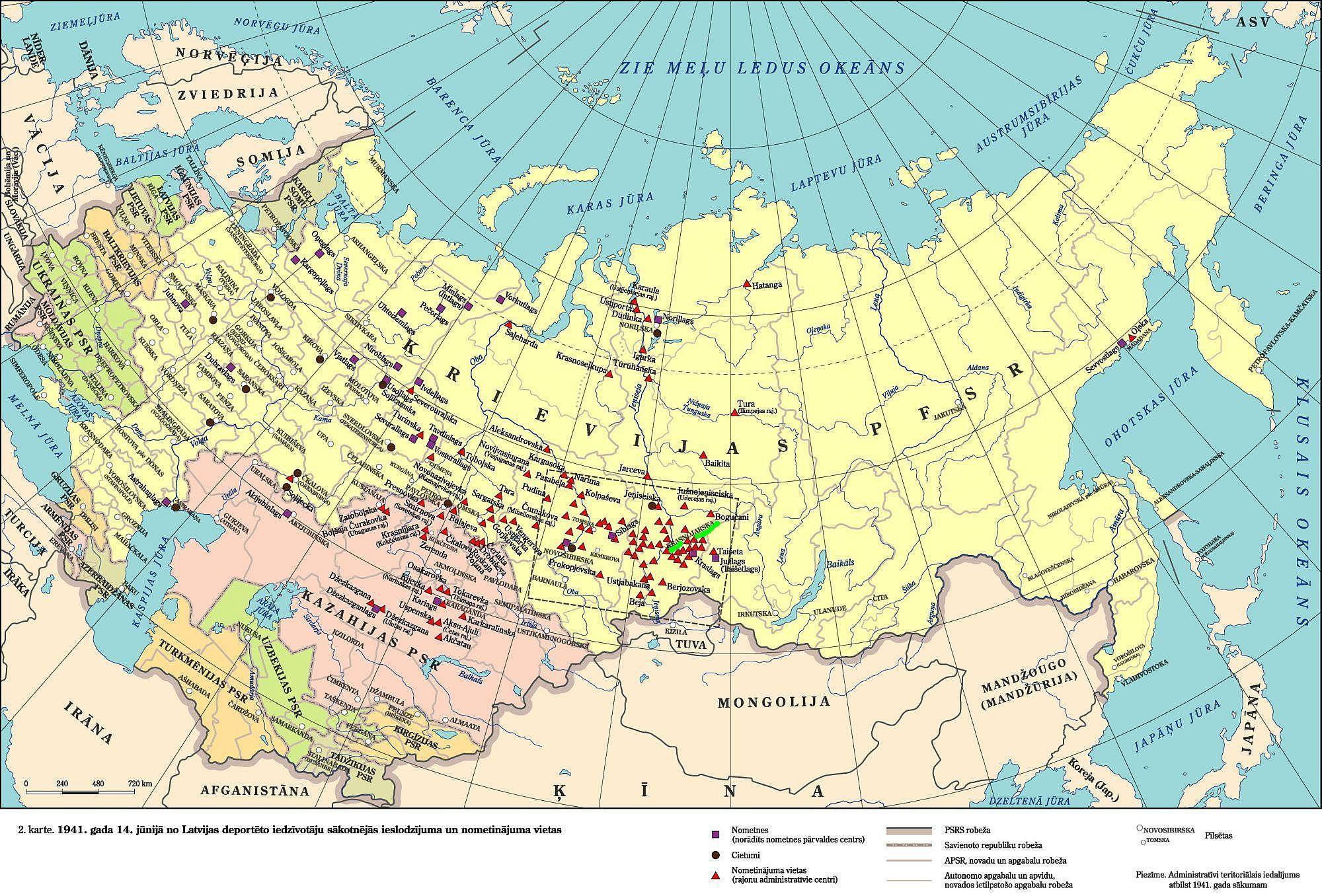 Deportētos ģimenes locekļus izvietoja galvenokārt Krasnojarskas apgabalā, daļu arī Novosibirskas apgabalā un Kazahijā. [1949. gada] karti sagatavoja Latvijas Valsts arhīva darbinieki, izpētot vairāk nekā piecus tūkstošus personu un apkopojot datus par to, kādās nometnēs viņi bija ieslodzīti un kādos rajonos bija nometināti viņu ģimenes locekļi.
