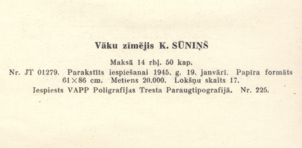 Nr. JT 01279. Prepared for printing 19 January 1945. Sheet size 61 x 86 cm. Printing run 20,000 copies. Sheet count 17.