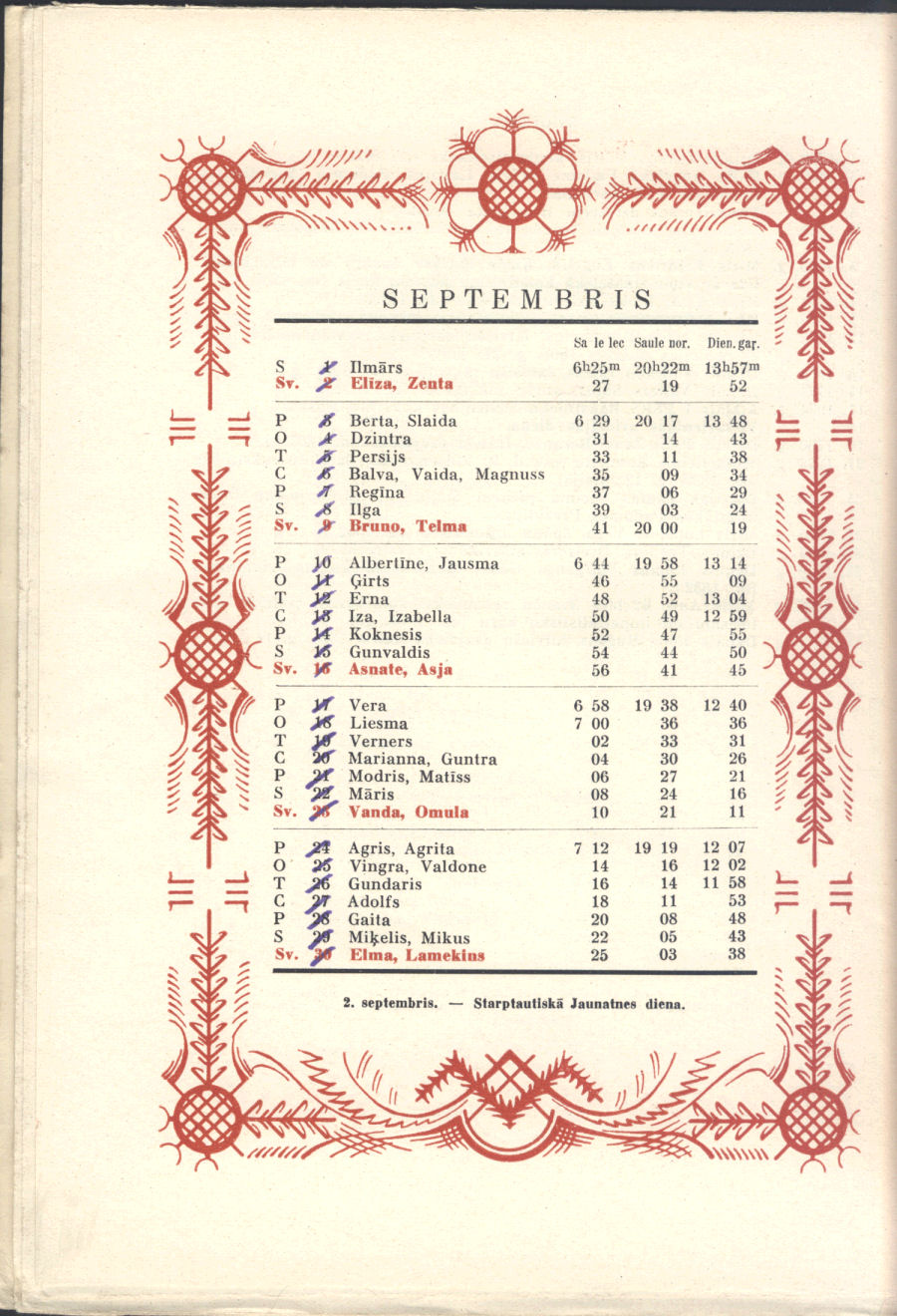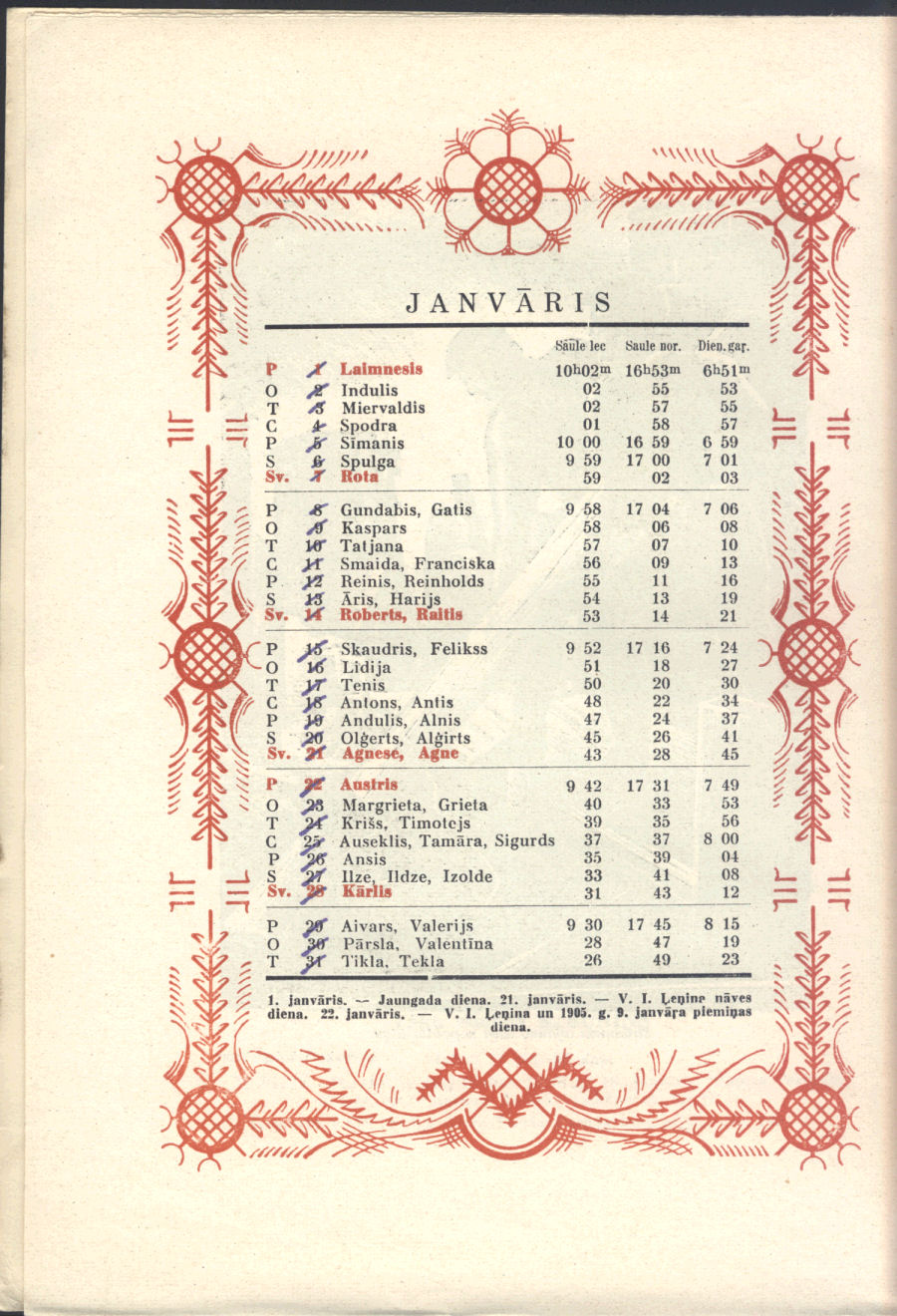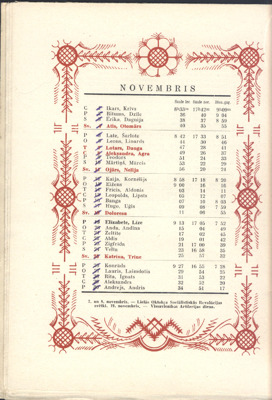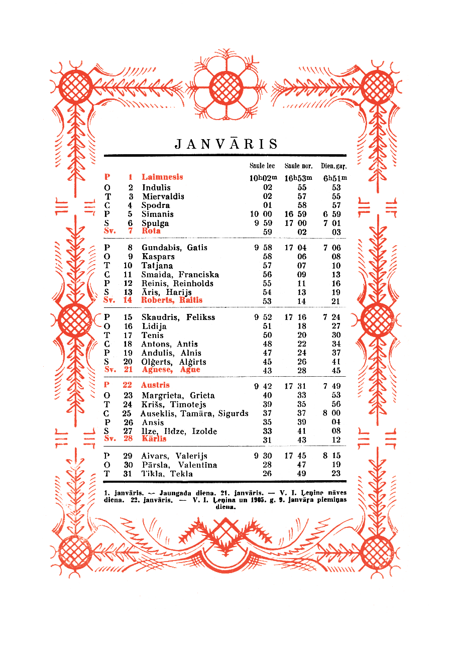 From our personal perspective, Sūniņš favorite themes were very much in keeping with that generation of Latvian painters, mirroring post-WWII exile Latvian art. Adapted from Sūniņš biography at Latvian Wikipedia. There's no indication if he was also the artist for the calendar pages' decorative border.