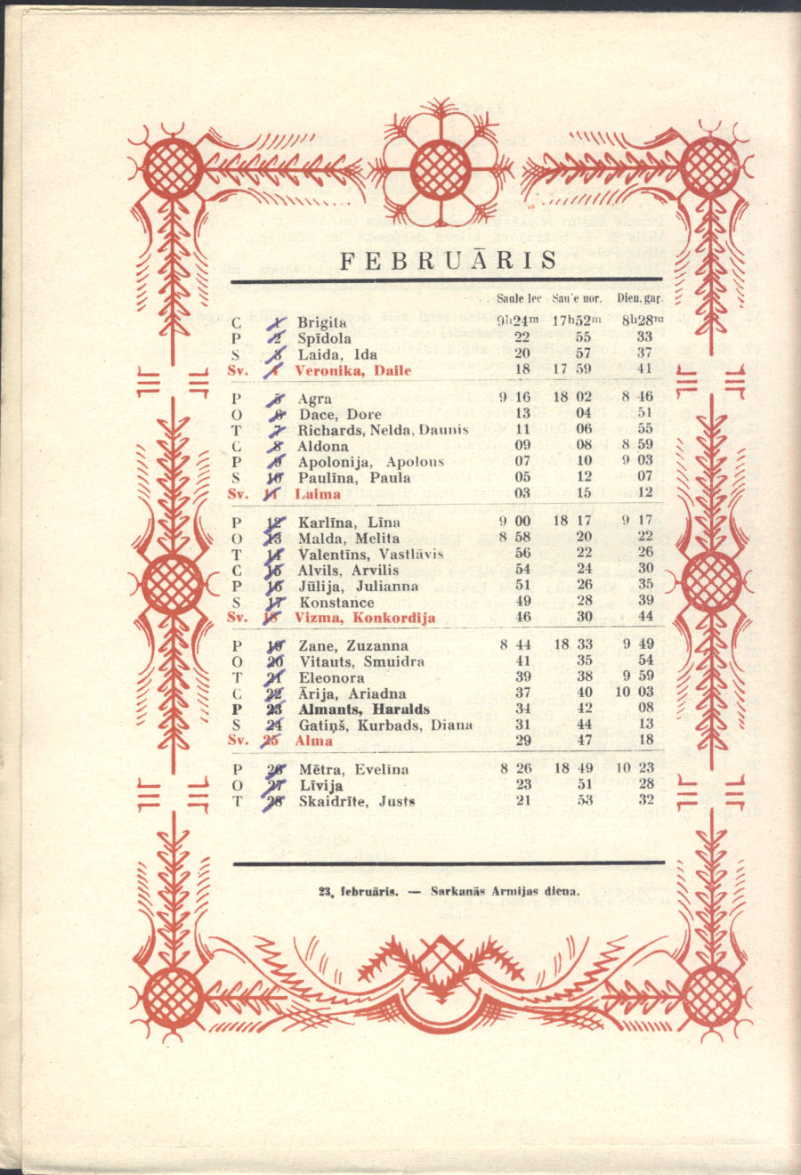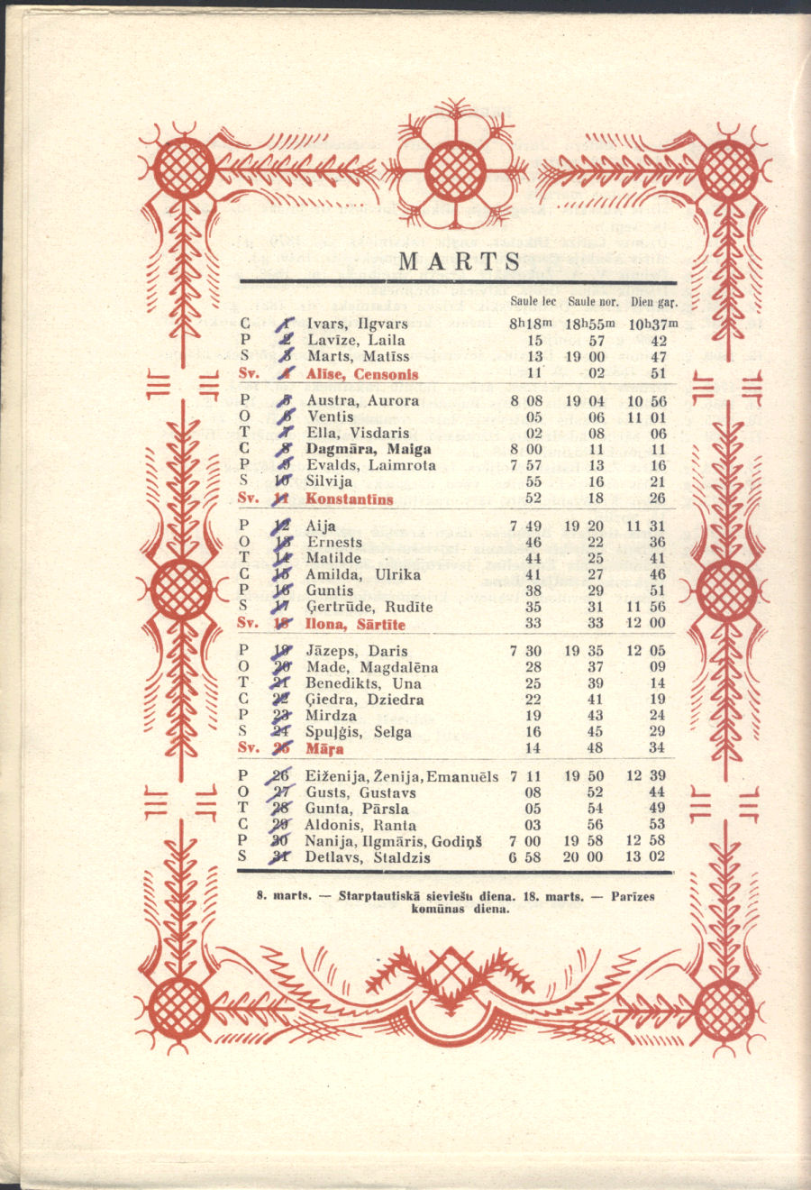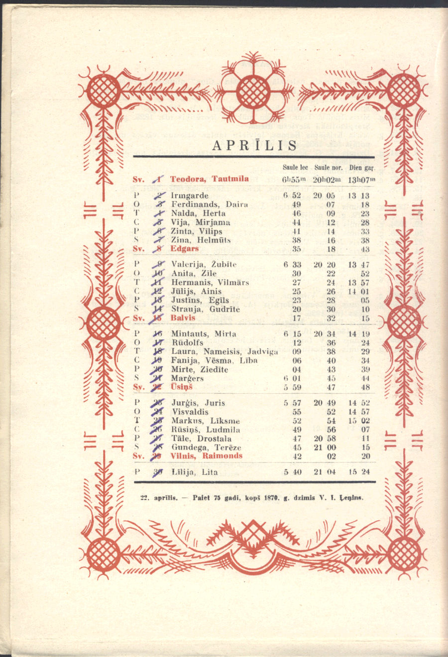 From our personal perspective, Sūniņš favorite themes were very much in keeping with that generation of Latvian painters, mirroring post-WWII exile Latvian art. Adapted from Sūniņš biography at Latvian Wikipedia. There's no indication if he was also the artist for the calendar pages' decorative border.
